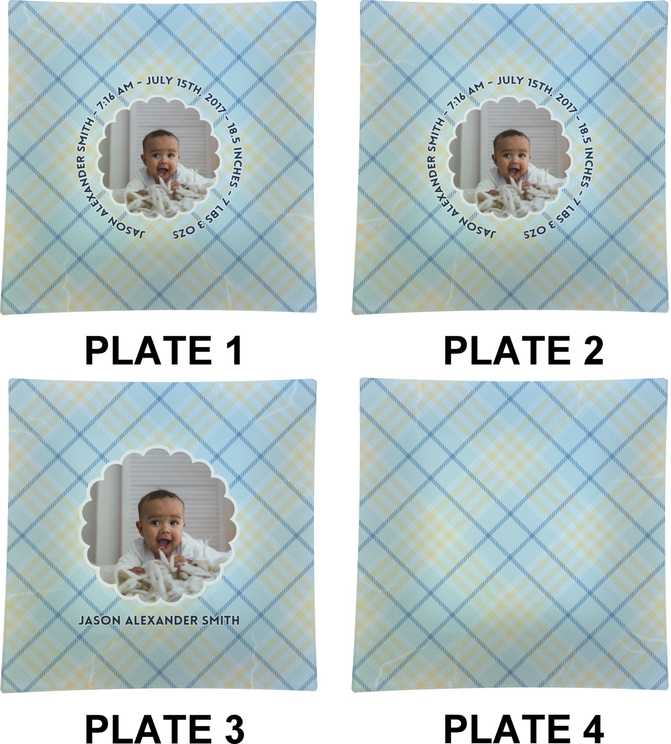 This design is for baby boys. The background is a baby blue plaid. In the middle of the design is a scalloped frame to upload your baby's picture into (make sure it is high quality!). Surrounding the frame is where your personalization goes. Put their name, birthday, or whatever you like.