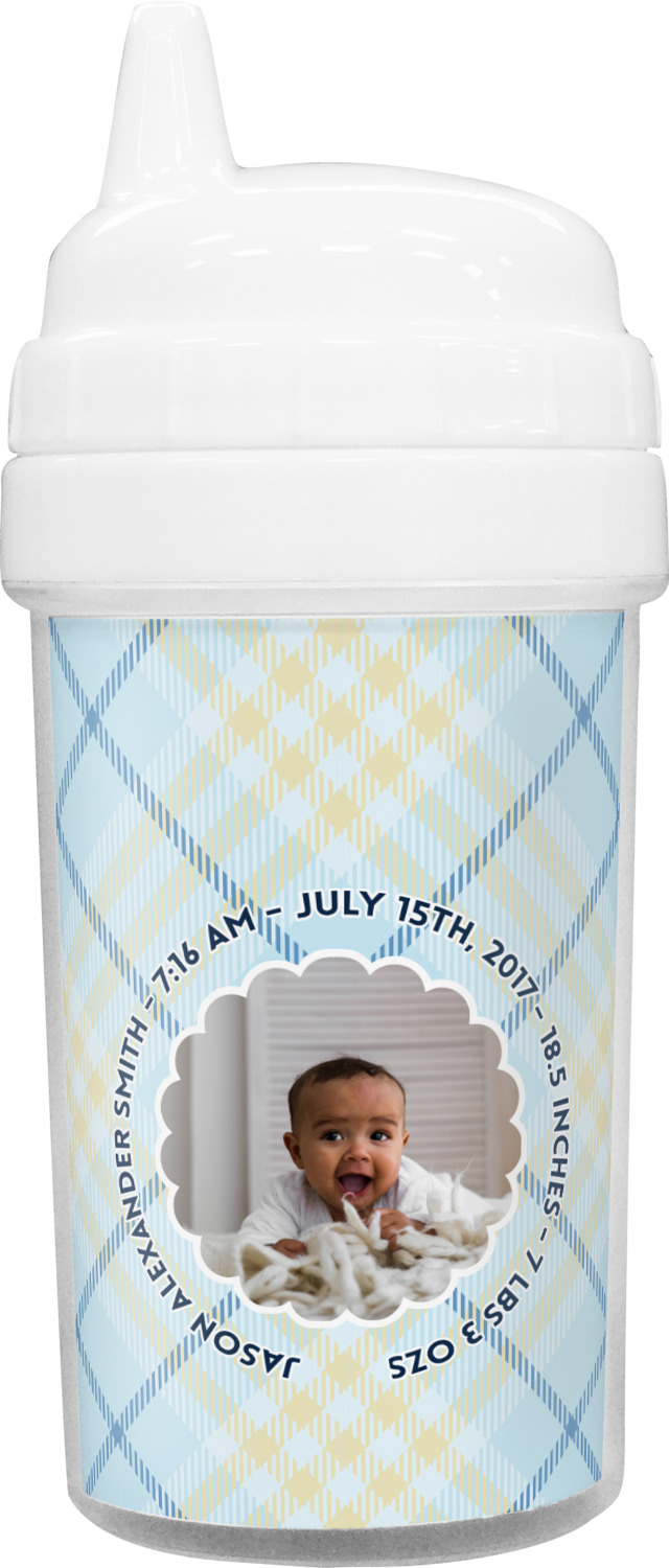Our toddler cups are free of BPA, and have a twist-open lid so that you can easily fill and clean these cups for your young ones. Each cup also comes with a sippy nozzle to reduce spills. We offer these custom sippy cups in two different sizes; we have a baby sippy cup that holds 5 ounces, and a toddler sippy cup that holds 10 ounces. Your customization is printed on a premium glossy media insert that is placed within these toddler drinking cups.
