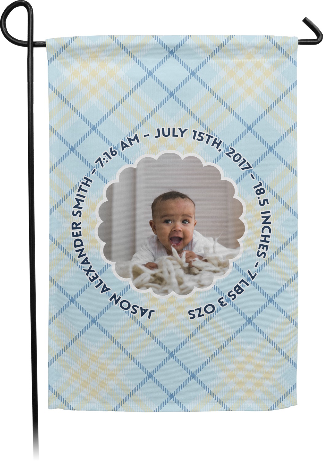 These custom garden flags are made of a durable, double-ply, polyester weave, allowing them to withstand the elements year round. The small flags measure at approximately 12 by 18 inches. The large flags measure out to 28 by 37 inches. You can order these decorative flags with your customization printed on the front only, or the front and back.