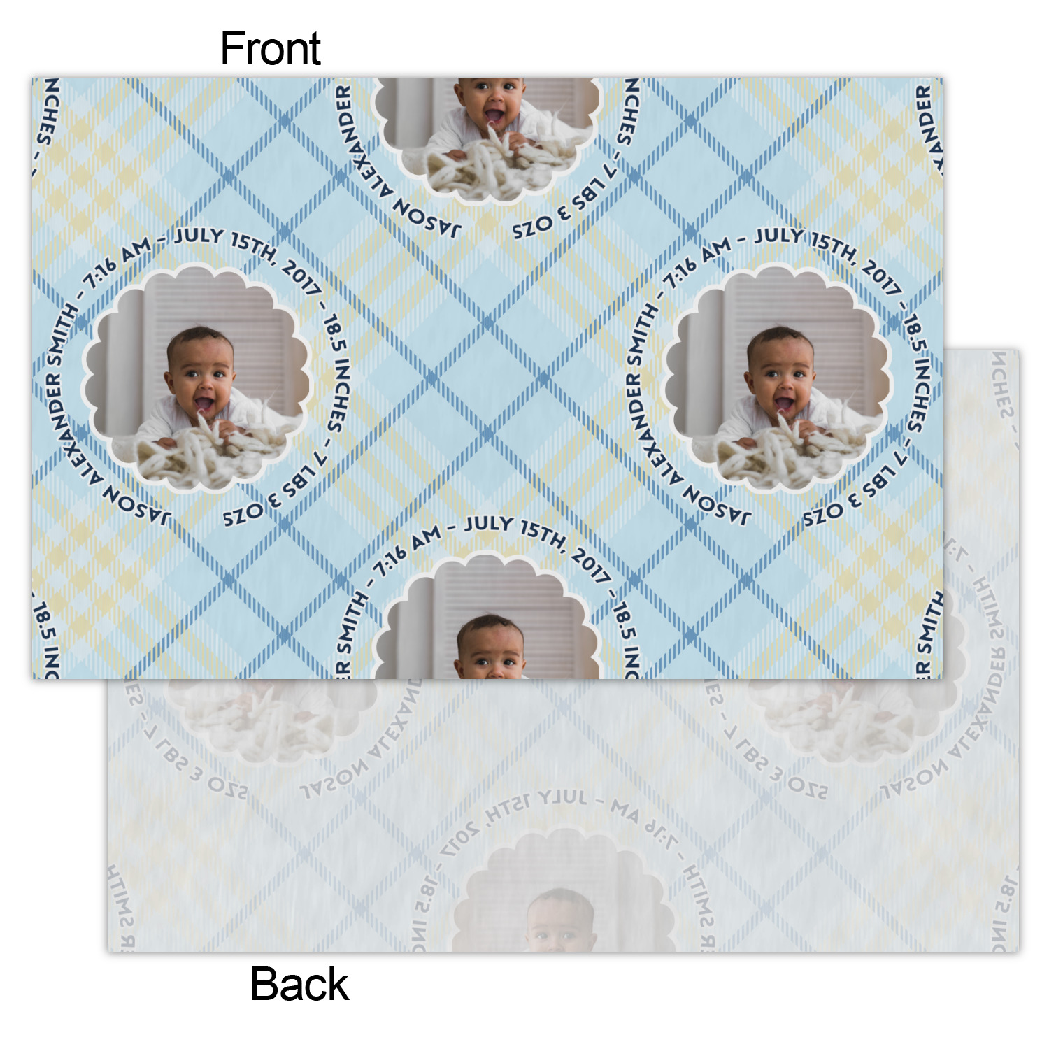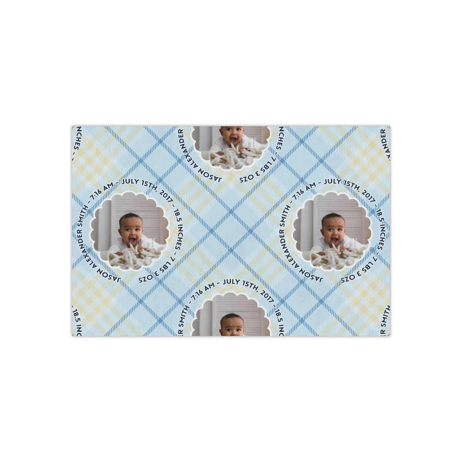 This design is for baby boys. The background is a baby blue plaid. In the middle of the design is a scalloped frame to upload your baby's picture into (make sure it is high quality!). Surrounding the frame is where your personalization goes. Put their name, birthday, or whatever you like.