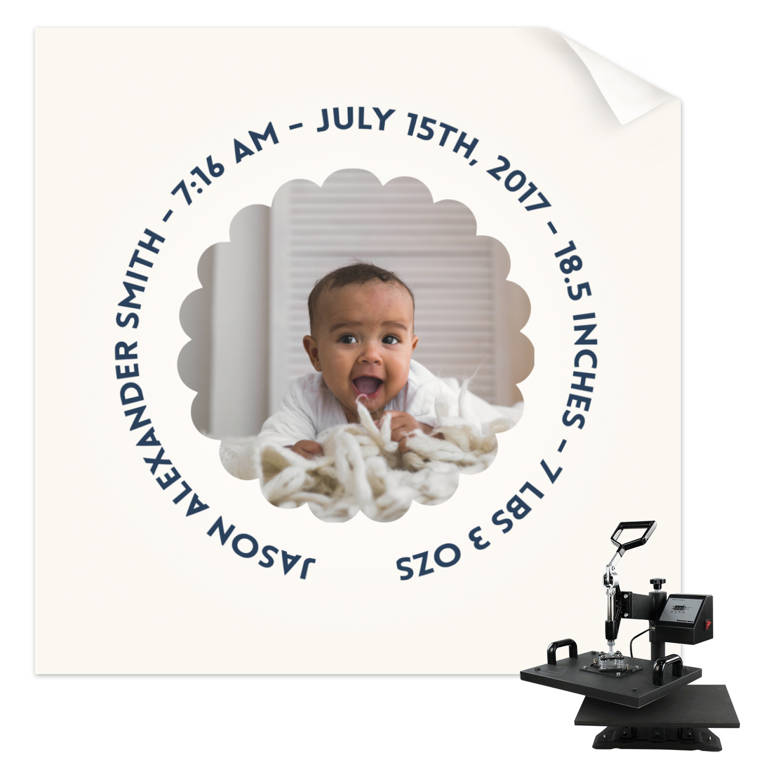 This design is for baby boys. The background is a baby blue plaid. In the middle of the design is a scalloped frame to upload your baby's picture into (make sure it is high quality!). Surrounding the frame is where your personalization goes. Put their name, birthday, or whatever you like.