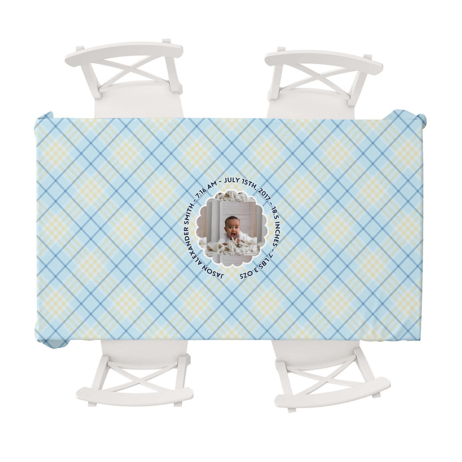 This design is for baby boys. The background is a baby blue plaid. In the middle of the design is a scalloped frame to upload your baby's picture into (make sure it is high quality!). Surrounding the frame is where your personalization goes. Put their name, birthday, or whatever you like.
