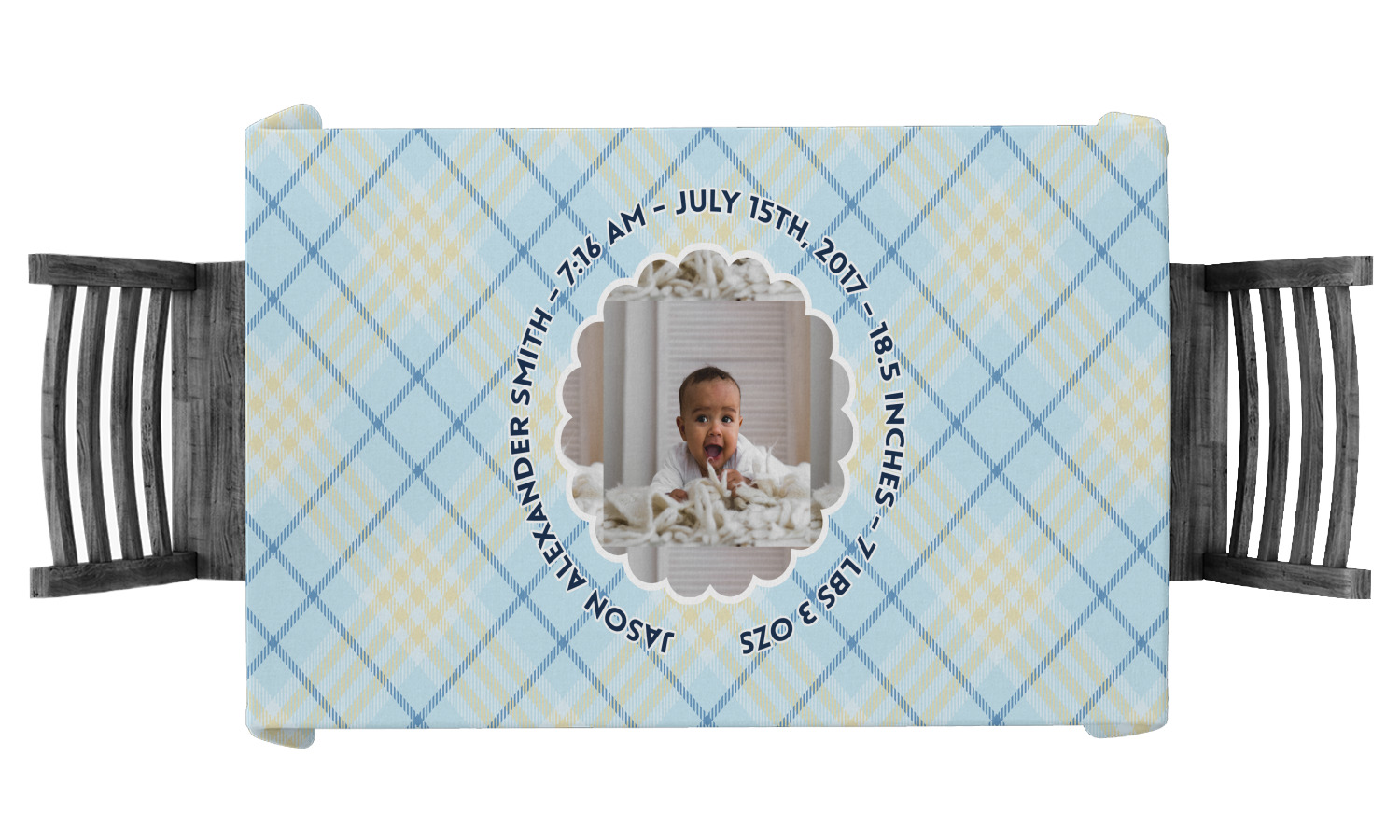This design is for baby boys. The background is a baby blue plaid. In the middle of the design is a scalloped frame to upload your baby's picture into (make sure it is high quality!). Surrounding the frame is where your personalization goes. Put their name, birthday, or whatever you like.