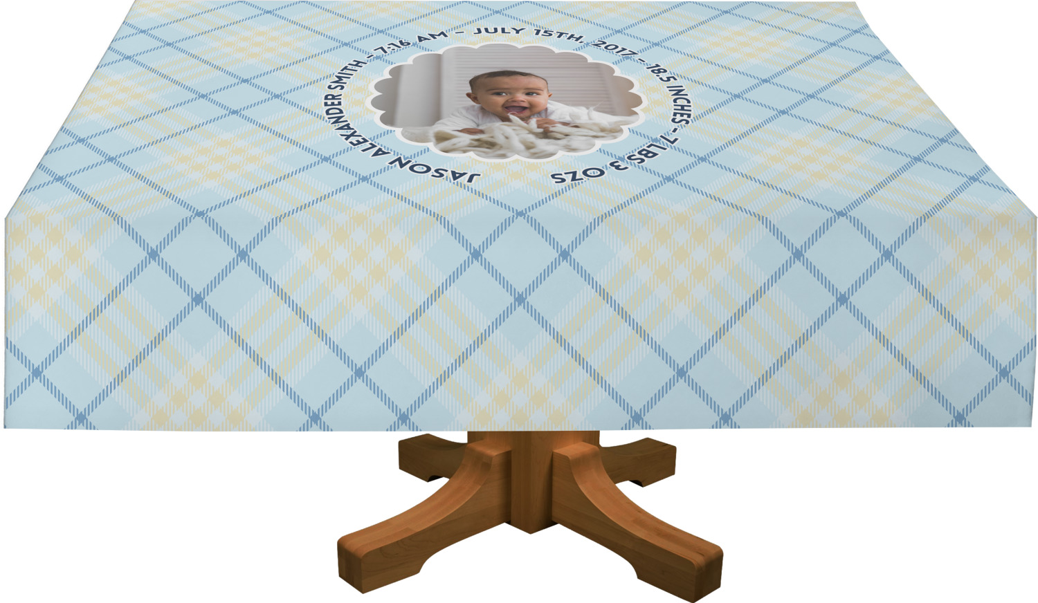 This design is for baby boys. The background is a baby blue plaid. In the middle of the design is a scalloped frame to upload your baby's picture into (make sure it is high quality!). Surrounding the frame is where your personalization goes. Put their name, birthday, or whatever you like.