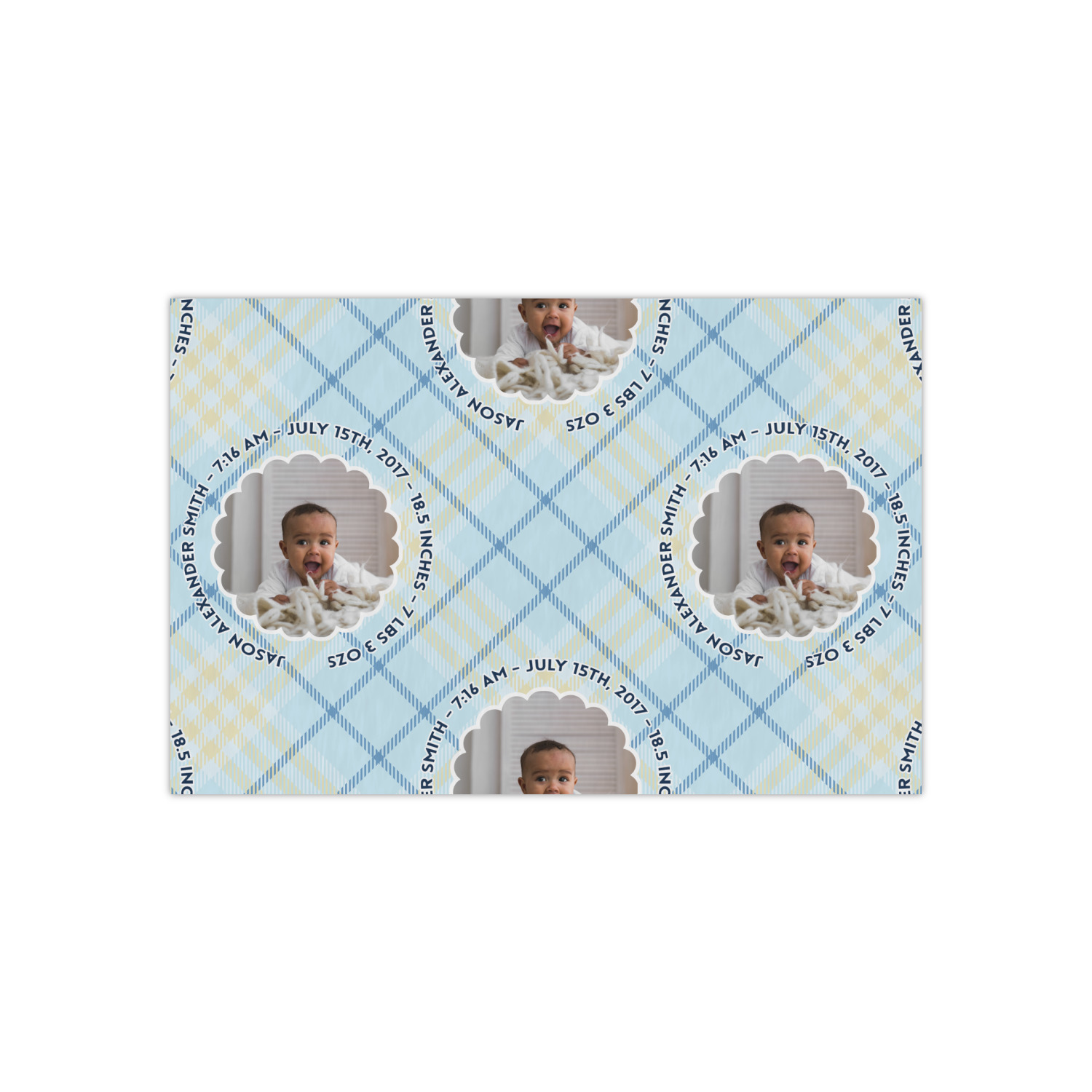 This design is for baby boys. The background is a baby blue plaid. In the middle of the design is a scalloped frame to upload your baby's picture into (make sure it is high quality!). Surrounding the frame is where your personalization goes. Put their name, birthday, or whatever you like.
