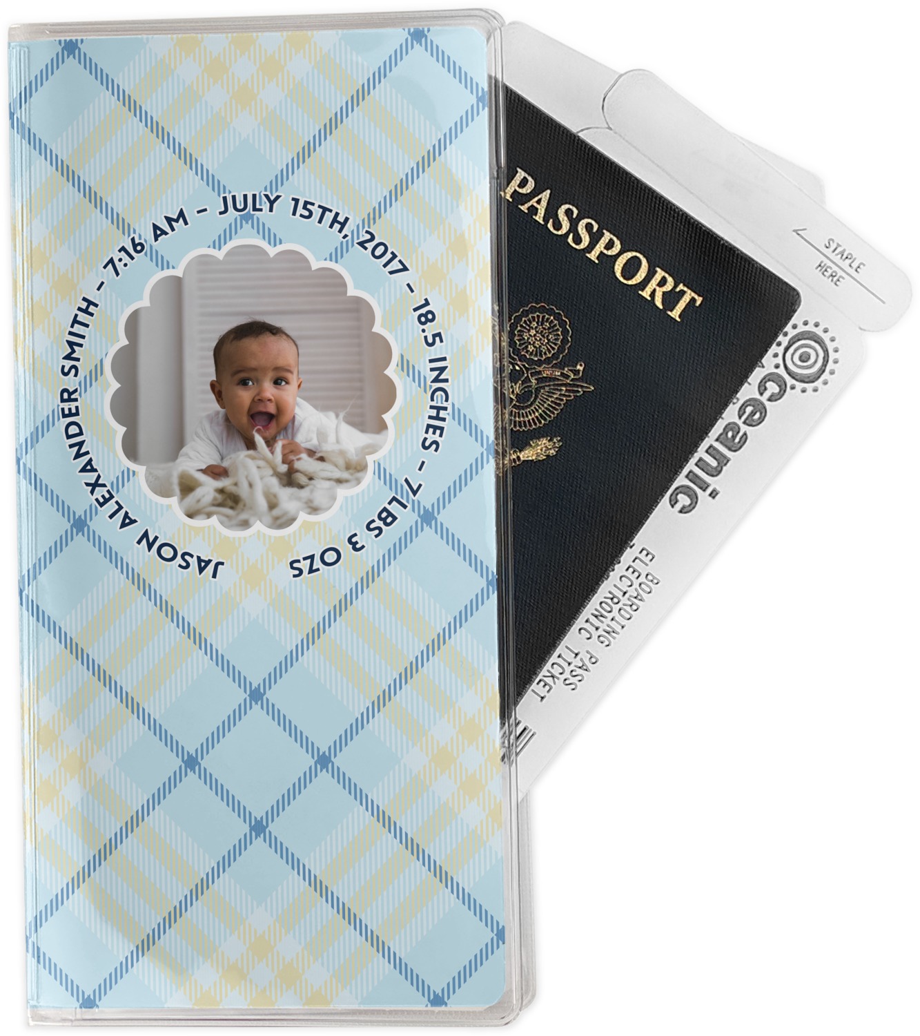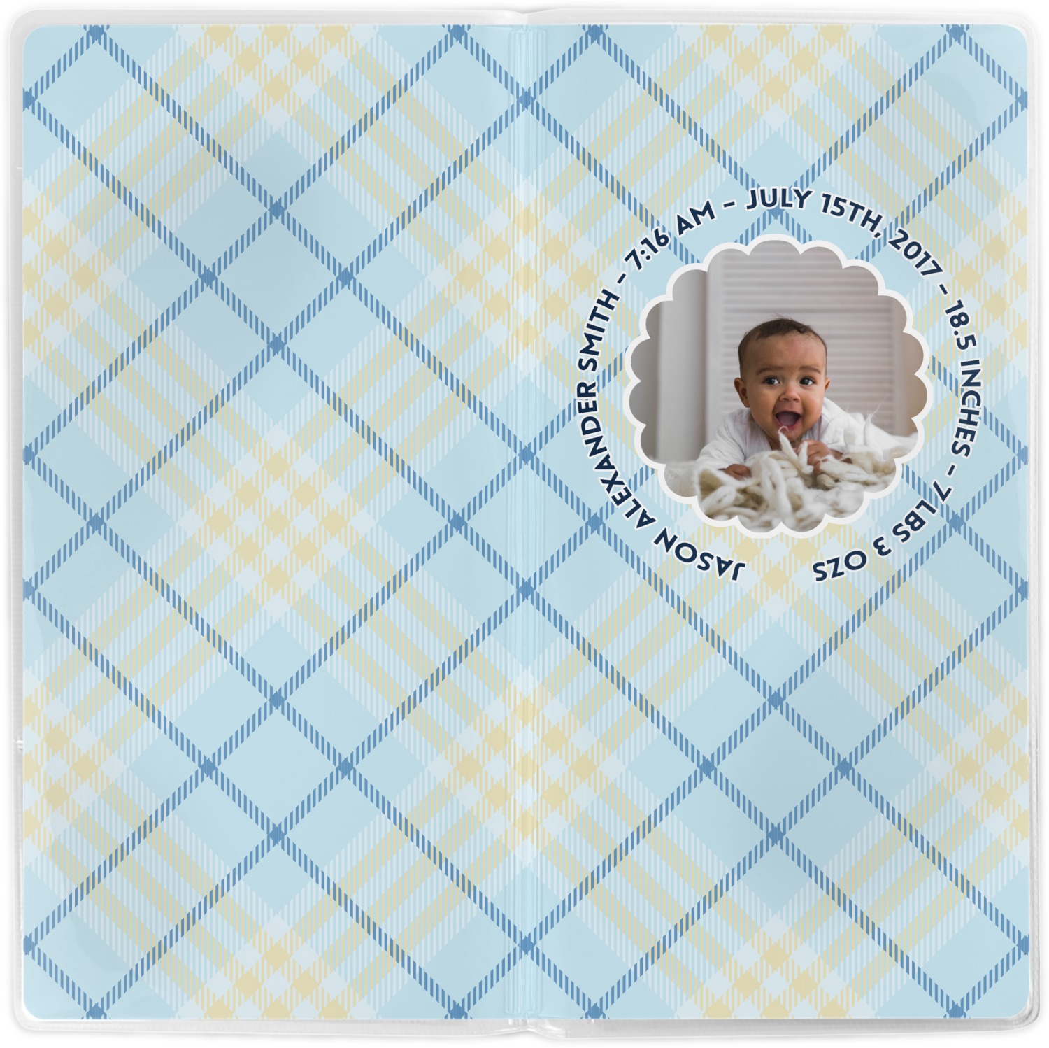 This design is for baby boys. The background is a baby blue plaid. In the middle of the design is a scalloped frame to upload your baby's picture into (make sure it is high quality!). Surrounding the frame is where your personalization goes. Put their name, birthday, or whatever you like.