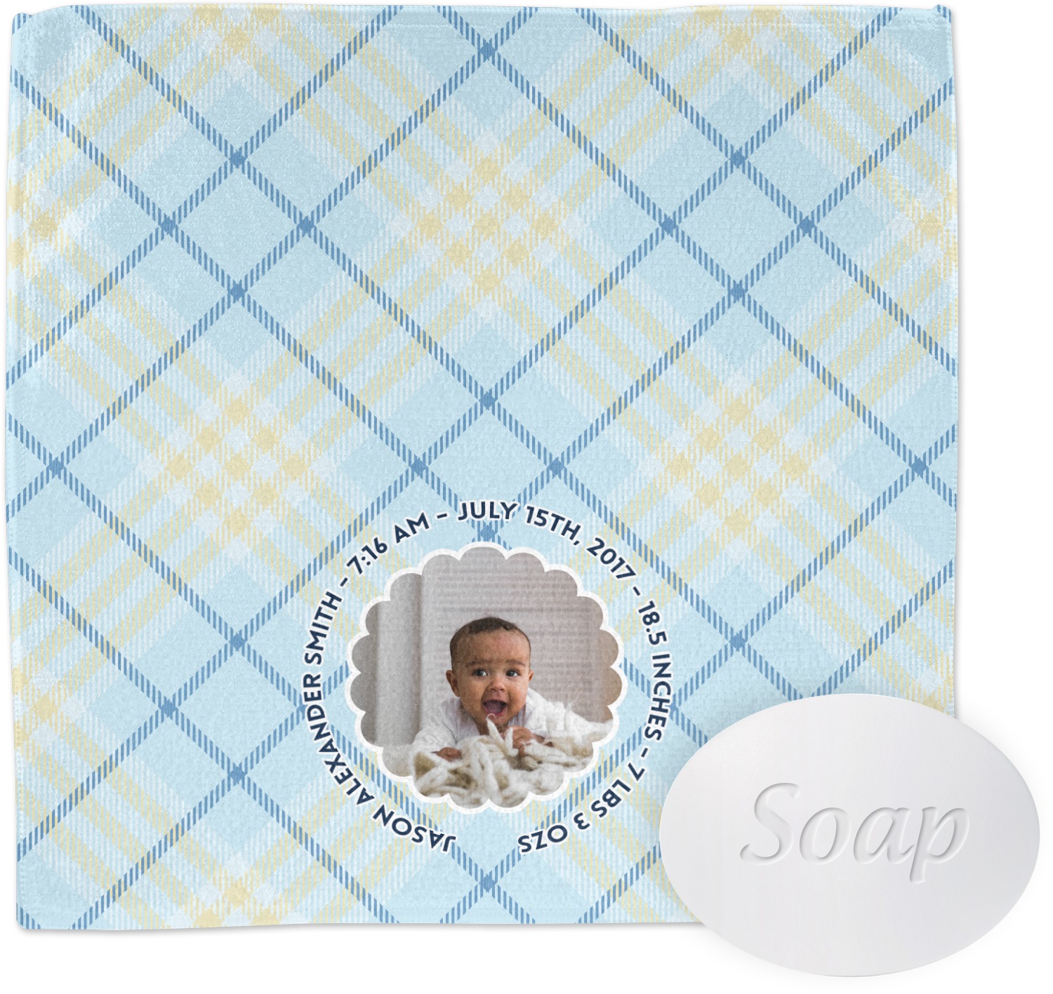 This design is for baby boys. The background is a baby blue plaid. In the middle of the design is a scalloped frame to upload your baby's picture into (make sure it is high quality!). Surrounding the frame is where your personalization goes. Put their name, birthday, or whatever you like.
