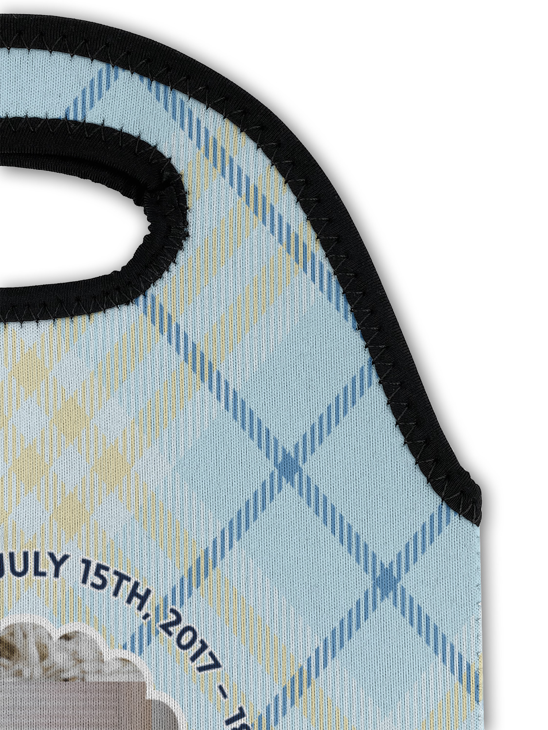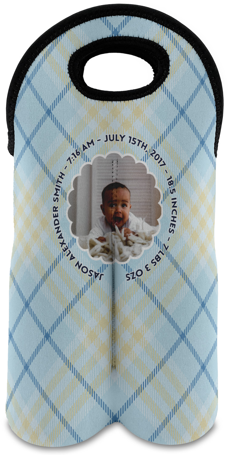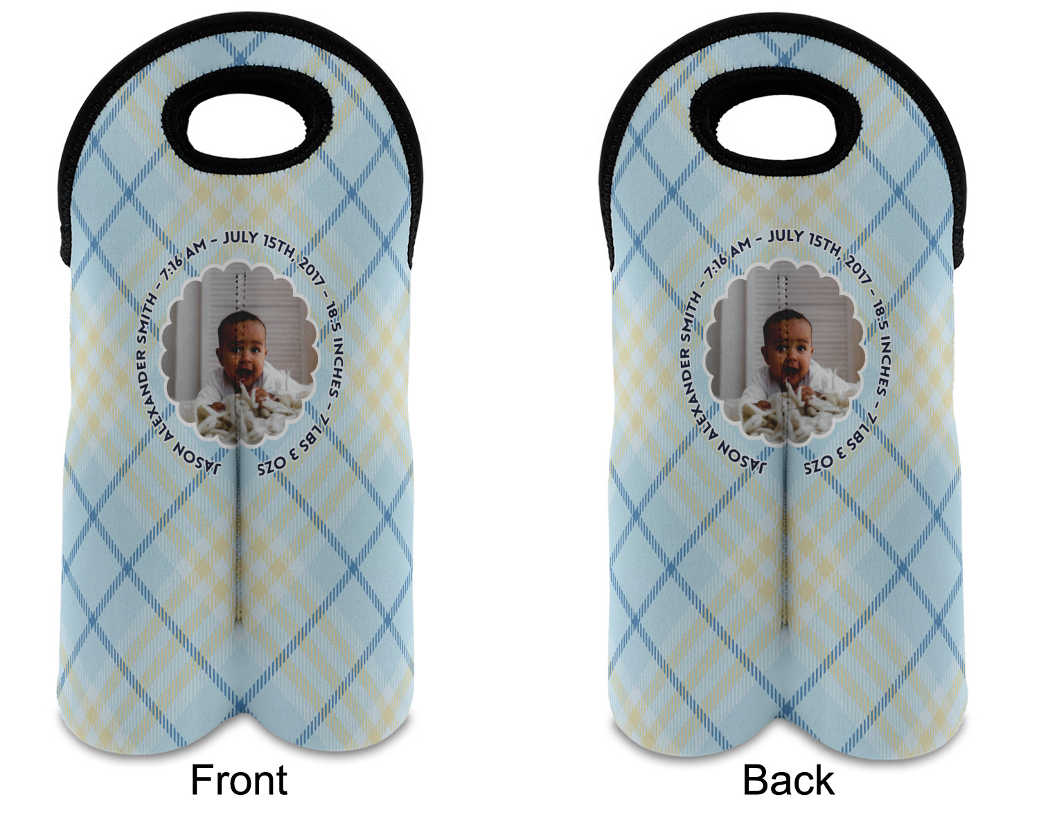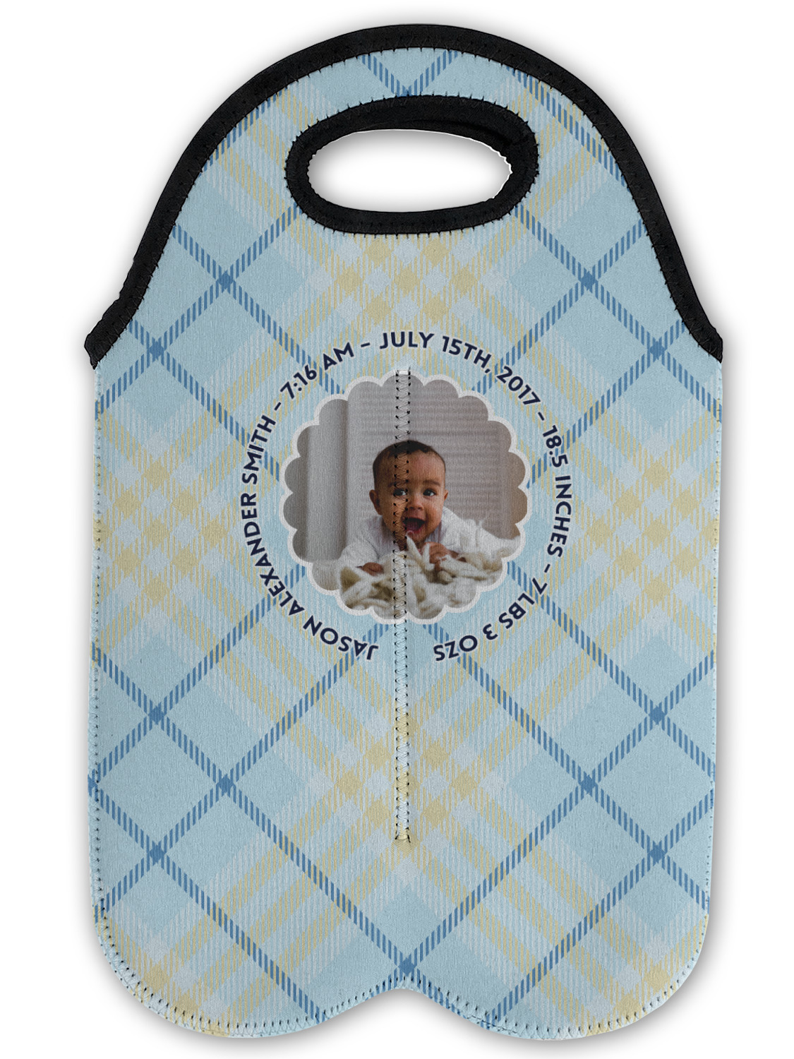 This design is for baby boys. The background is a baby blue plaid. In the middle of the design is a scalloped frame to upload your baby's picture into (make sure it is high quality!). Surrounding the frame is where your personalization goes. Put their name, birthday, or whatever you like.