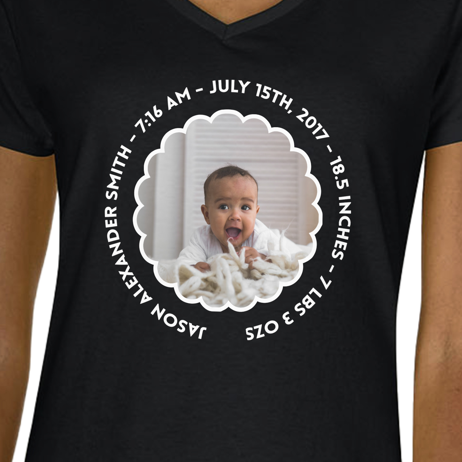 This design is for baby boys. The background is a baby blue plaid. In the middle of the design is a scalloped frame to upload your baby's picture into (make sure it is high quality!). Surrounding the frame is where your personalization goes. Put their name, birthday, or whatever you like.