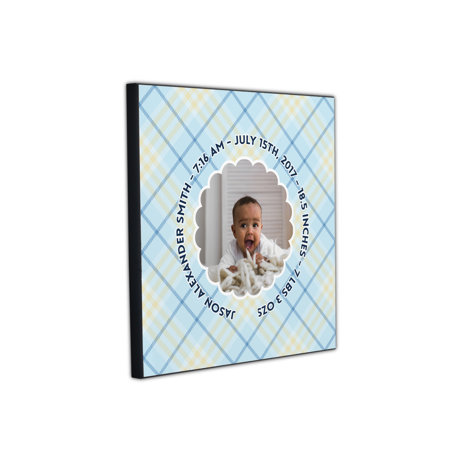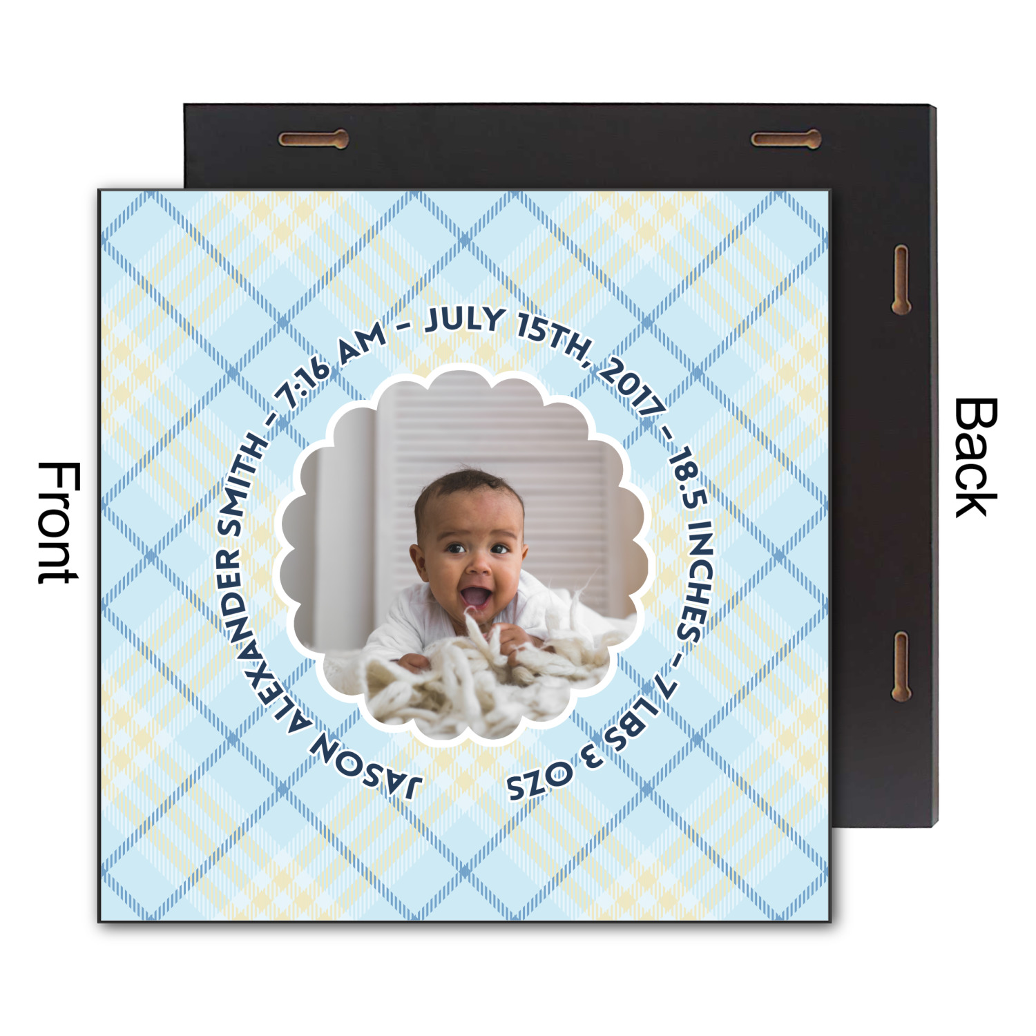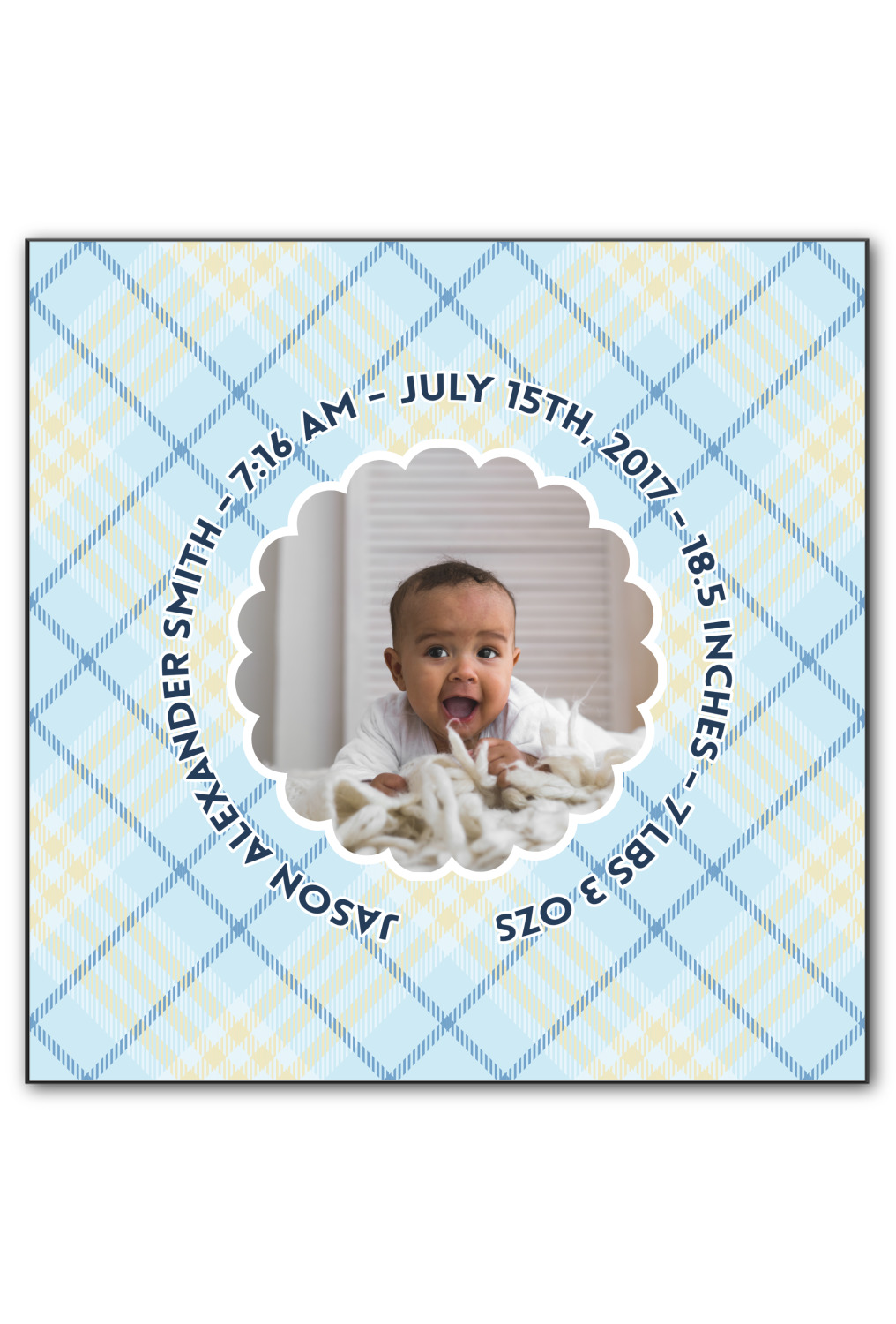 This design is for baby boys. The background is a baby blue plaid. In the middle of the design is a scalloped frame to upload your baby's picture into (make sure it is high quality!). Surrounding the frame is where your personalization goes. Put their name, birthday, or whatever you like.