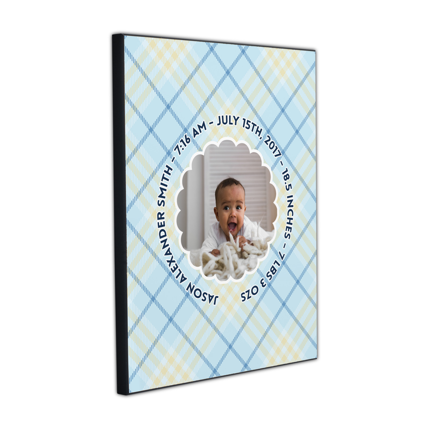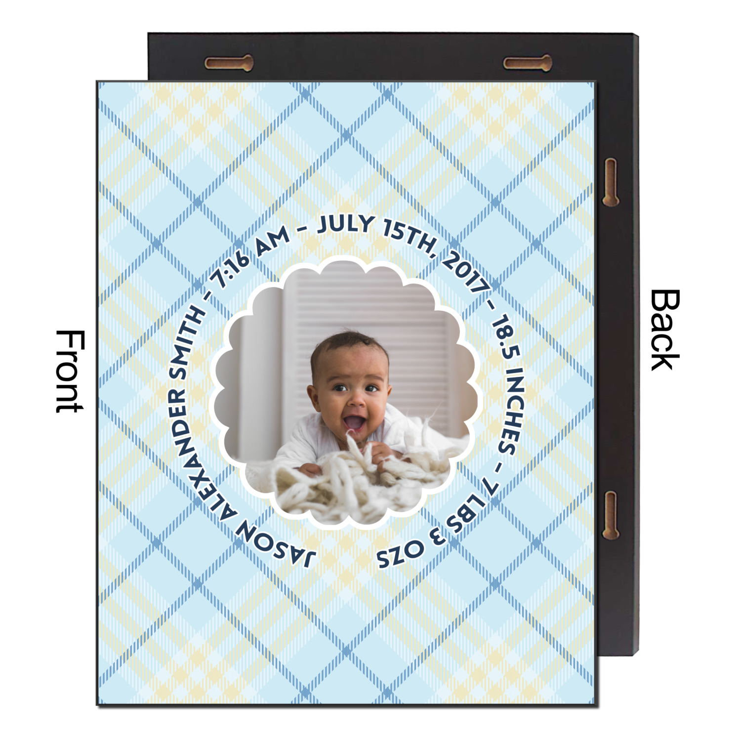 This design is for baby boys. The background is a baby blue plaid. In the middle of the design is a scalloped frame to upload your baby's picture into (make sure it is high quality!). Surrounding the frame is where your personalization goes. Put their name, birthday, or whatever you like.