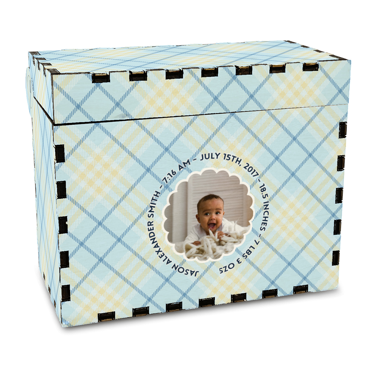 This design is for baby boys. The background is a baby blue plaid. In the middle of the design is a scalloped frame to upload your baby's picture into (make sure it is high quality!). Surrounding the frame is where your personalization goes. Put their name, birthday, or whatever you like.