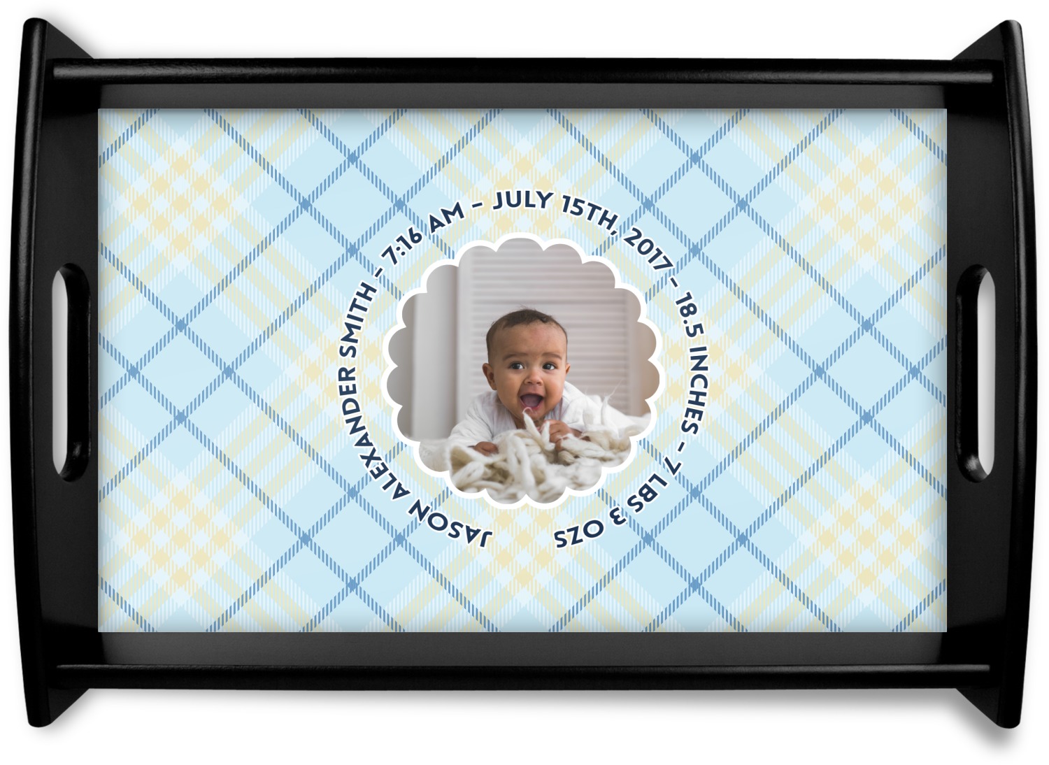 This design is for baby boys. The background is a baby blue plaid. In the middle of the design is a scalloped frame to upload your baby's picture into (make sure it is high quality!). Surrounding the frame is where your personalization goes. Put their name, birthday, or whatever you like.