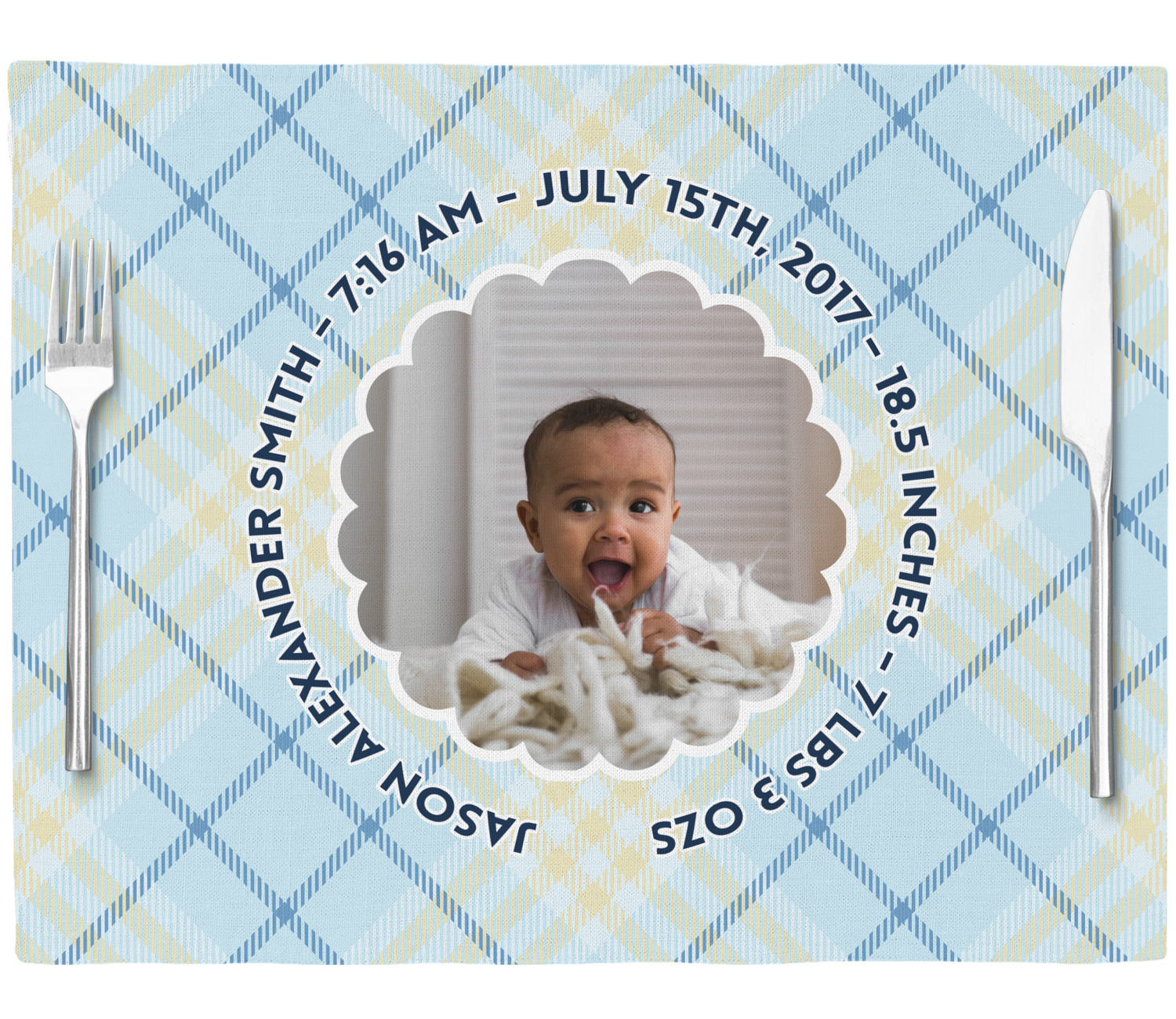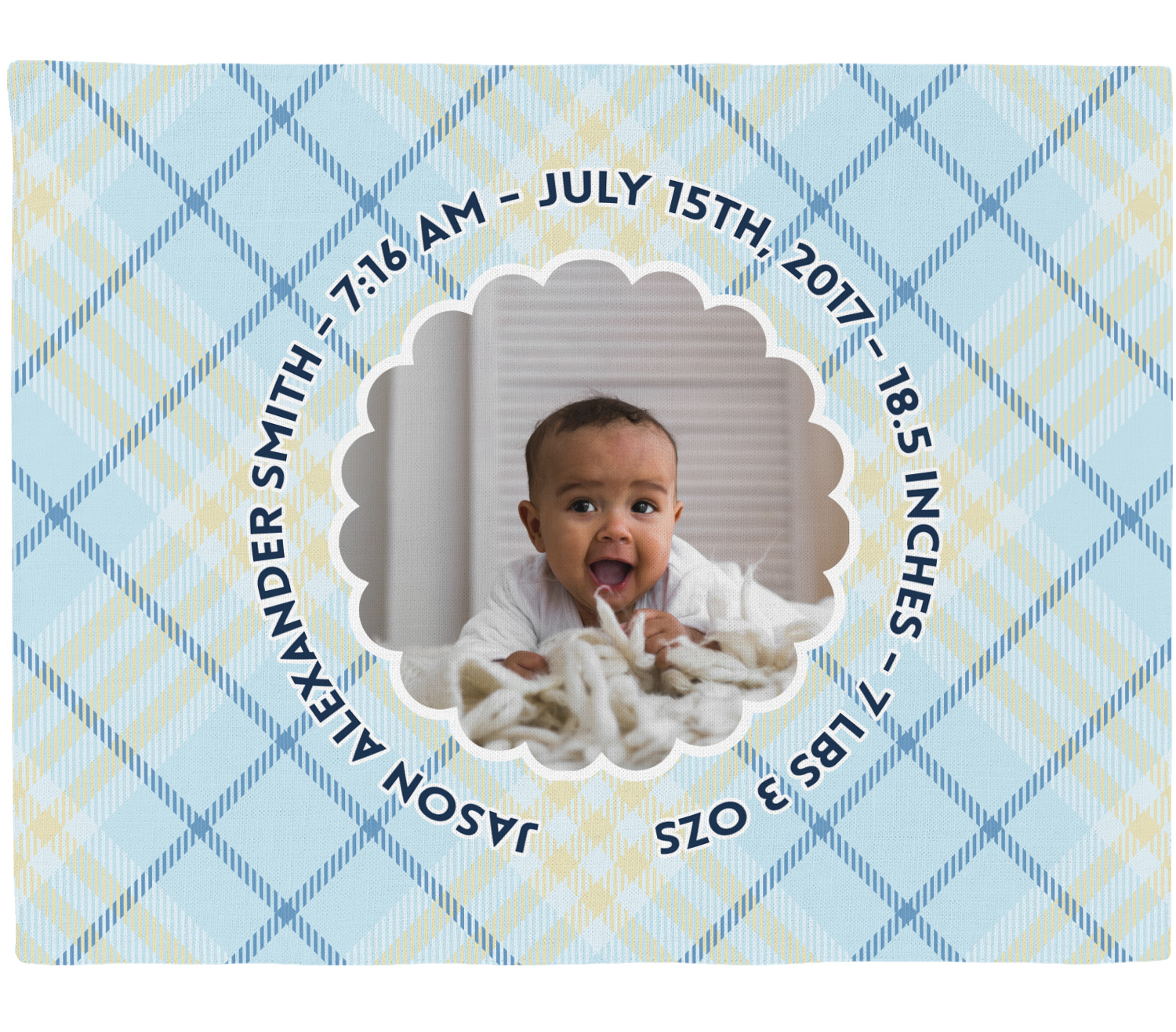 This design is for baby boys. The background is a baby blue plaid. In the middle of the design is a scalloped frame to upload your baby's picture into (make sure it is high quality!). Surrounding the frame is where your personalization goes. Put their name, birthday, or whatever you like.