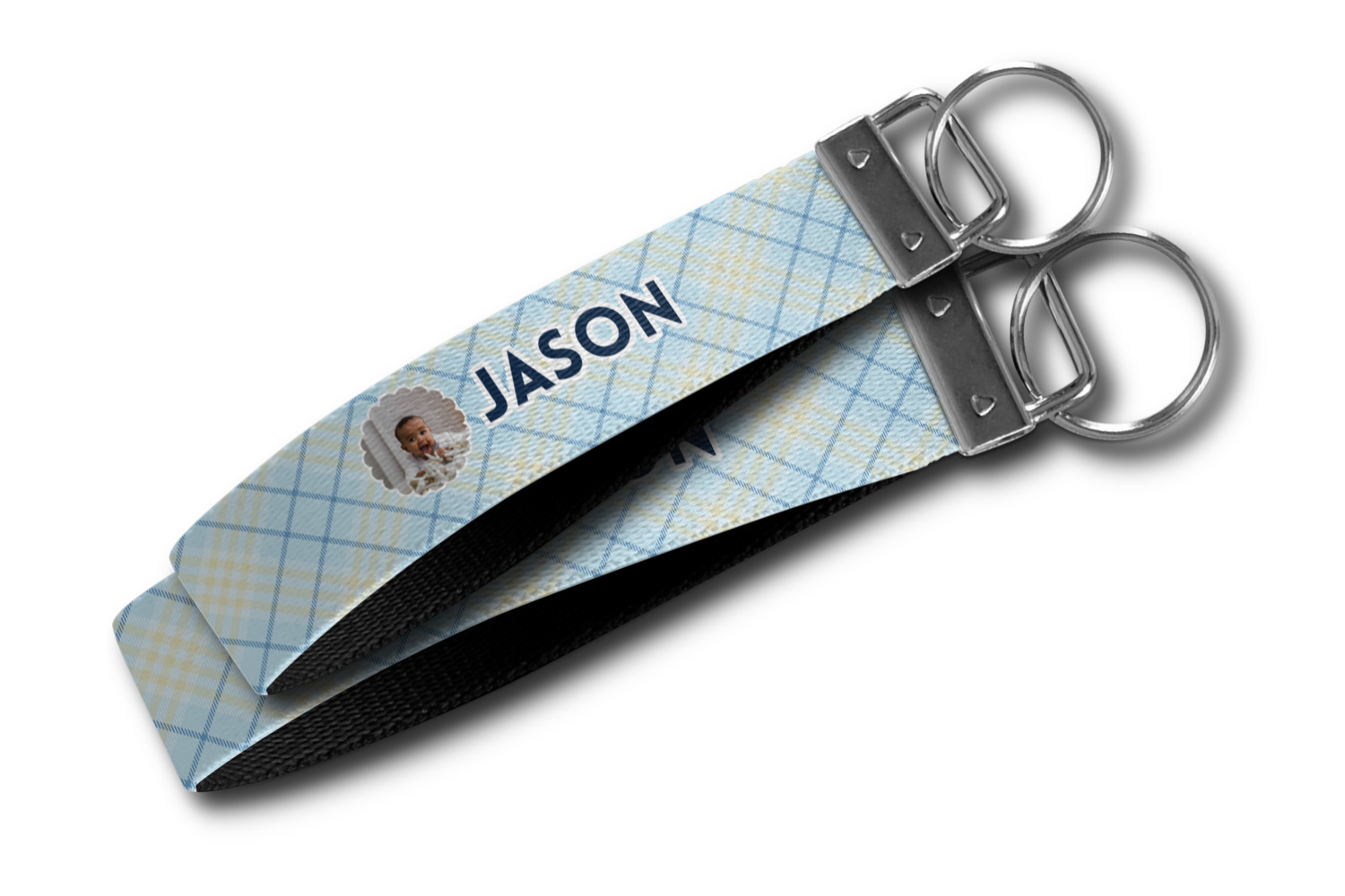 These key fob keychains are made from a polyester weave, right here in the USA. They feature a silver, metal clasp, attached to a round keyring. The piece gives the personalized wristlet a beautiful, finished look. Your customized design is printed on the outside of the keychain strap. We carry these wristlets in two sizes: small, which is 5 inches in width, and large, which is 5.5 inches in width.