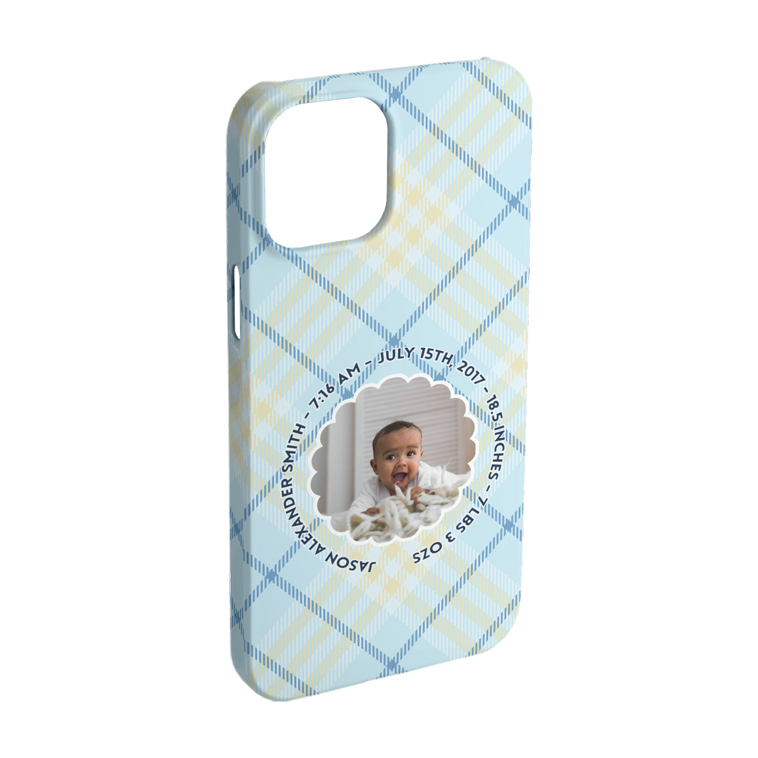 This design is for baby boys. The background is a baby blue plaid. In the middle of the design is a scalloped frame to upload your baby's picture into (make sure it is high quality!). Surrounding the frame is where your personalization goes. Put their name, birthday, or whatever you like.