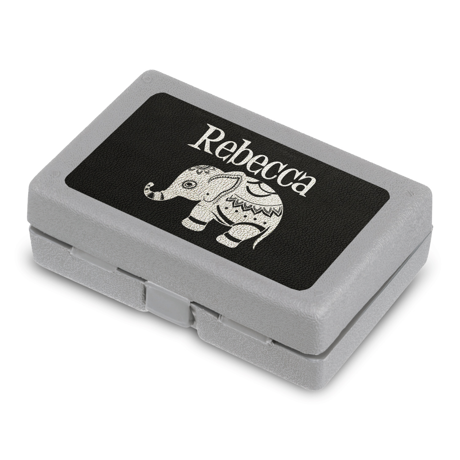 In a tri-fold hard shell case which measures 6" wide, 4" deep and 2" tall, this kit is the perfect size to keep in a desk, garage drawer, or anywhere else in the house. The snap closure keeps it securely closed to ensure the tools do not fall out. With the black faux leather on the outside engraved with your choice of personalization it will be easier to ensure it stays yours by being customized just for you!