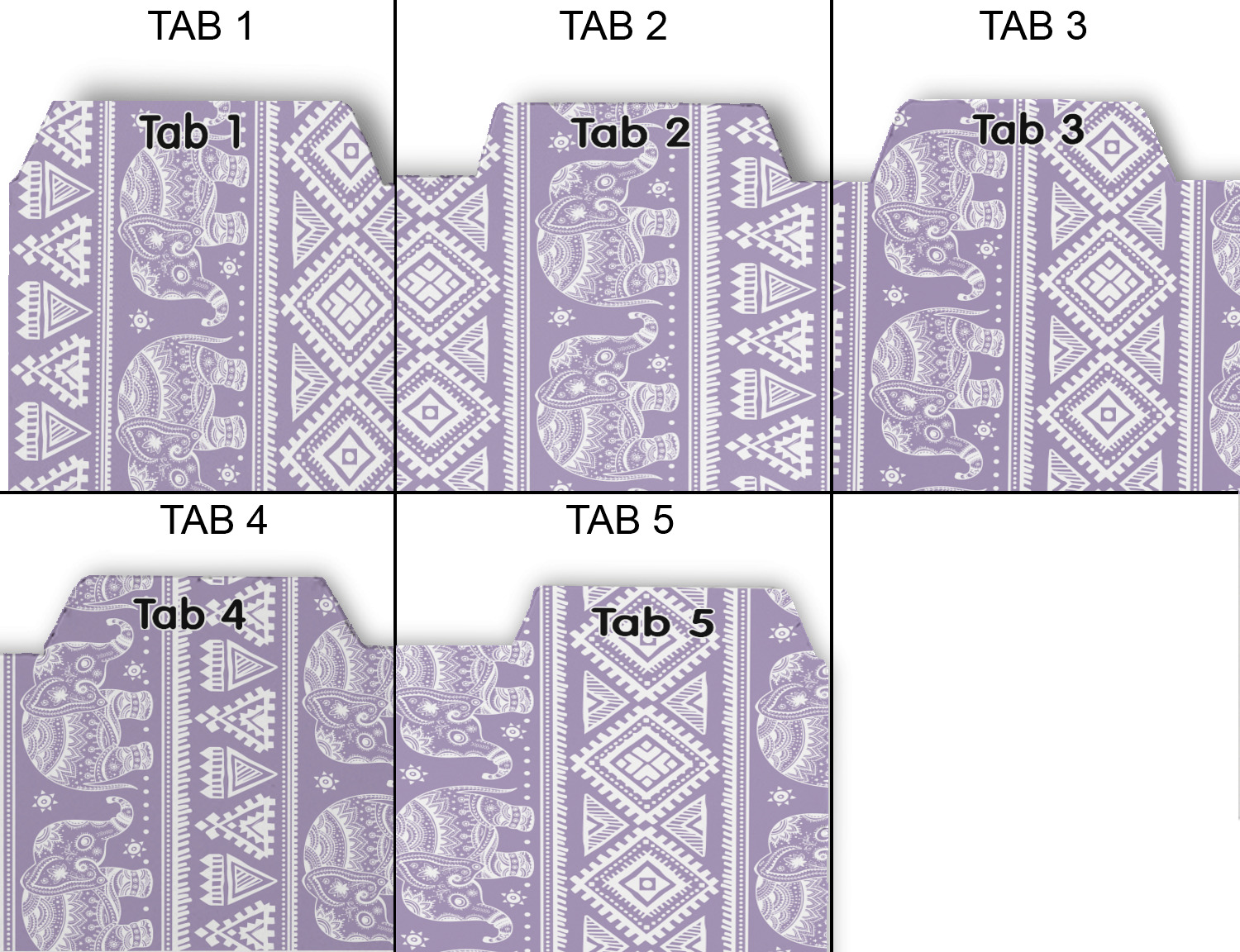 Whether you use binders at school or at work, we have designs to suit all of them. Available in 5 or 6 tab sets, you are sure to find a set to suit your needs. The back of each one is white and can be used to take notes, write vital information on, etc.