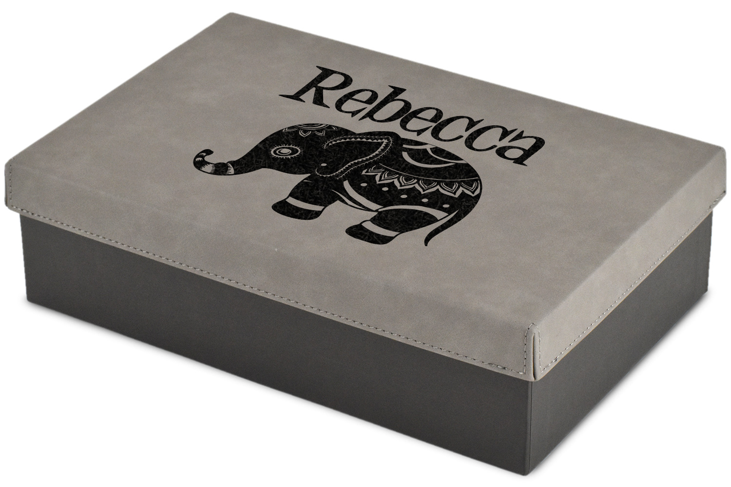 These gift boxes are available in 3 different sizes to accommodate various sized gifts. Available in gray as a neutral color for any occasion as well as to showcase your design boldly. Engraved with a laser this high quality paper board and faux leather gift box is unique and makes any gift stand out.
