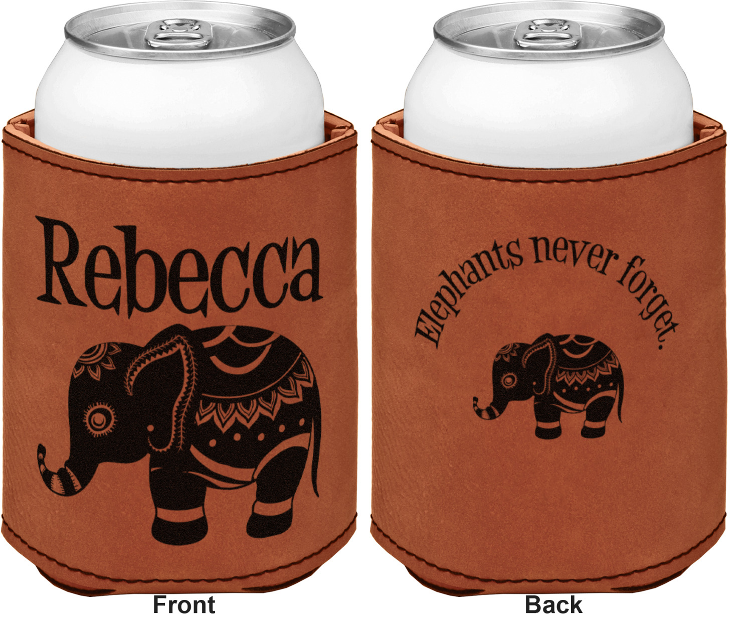 This can sleeve is made from a cognac-brown leatherette and stitched with a sturdy, black thread. A slim padding lines the inside of your can sleeve to allow for a better fit once your drink is inserted. The sleeve itself measures at 4 by 4.5 inches, allowing this custom can sleeve to accommodate most canned drinks. Your personalized design can be engraved on the front and back, or solely the front. When laser-engraved, your design appears as a black coloration which contrasts the leatherette nicely.