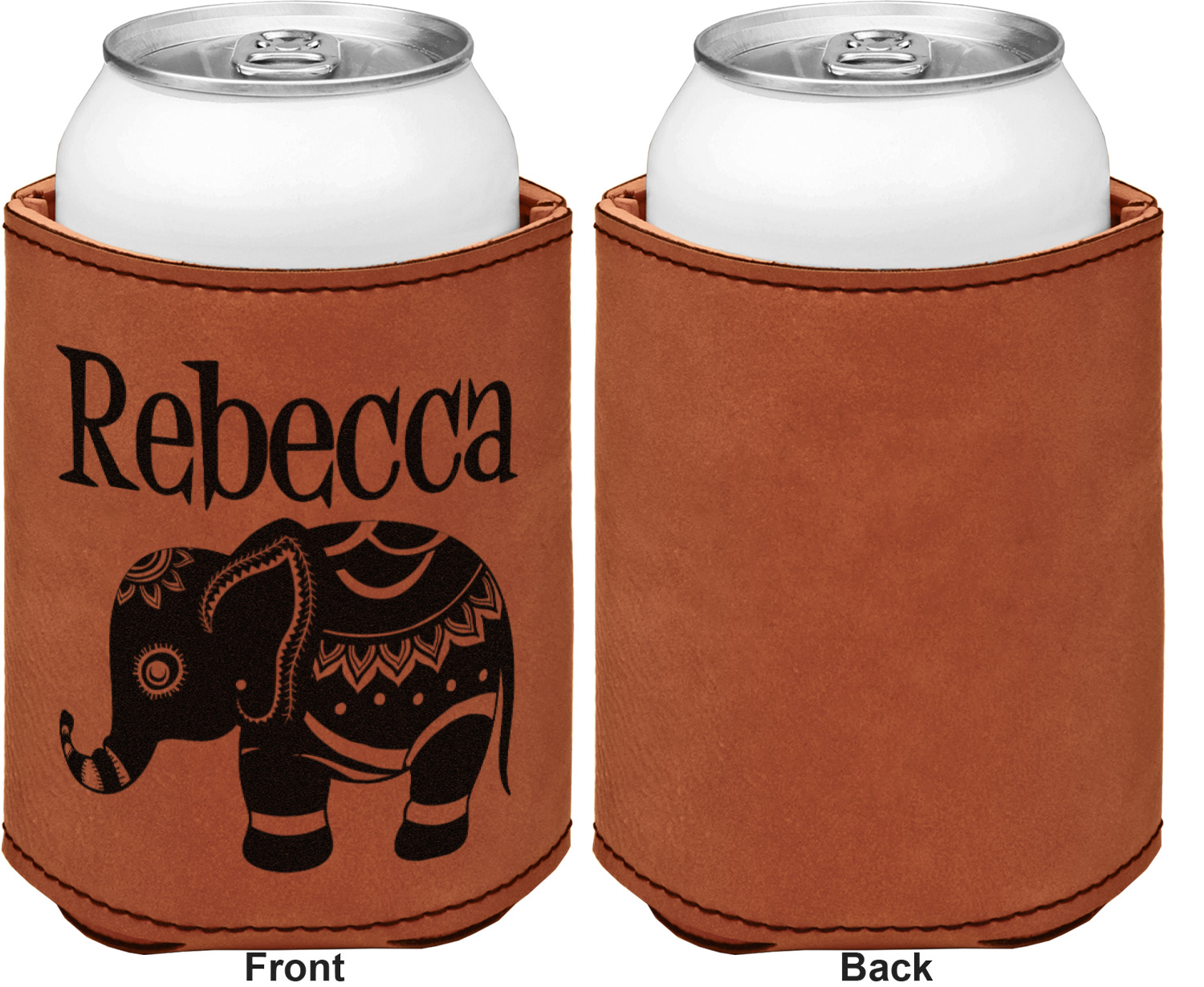 This can sleeve is made from a cognac-brown leatherette and stitched with a sturdy, black thread. A slim padding lines the inside of your can sleeve to allow for a better fit once your drink is inserted. The sleeve itself measures at 4 by 4.5 inches, allowing this custom can sleeve to accommodate most canned drinks. Your personalized design can be engraved on the front and back, or solely the front. When laser-engraved, your design appears as a black coloration which contrasts the leatherette nicely.