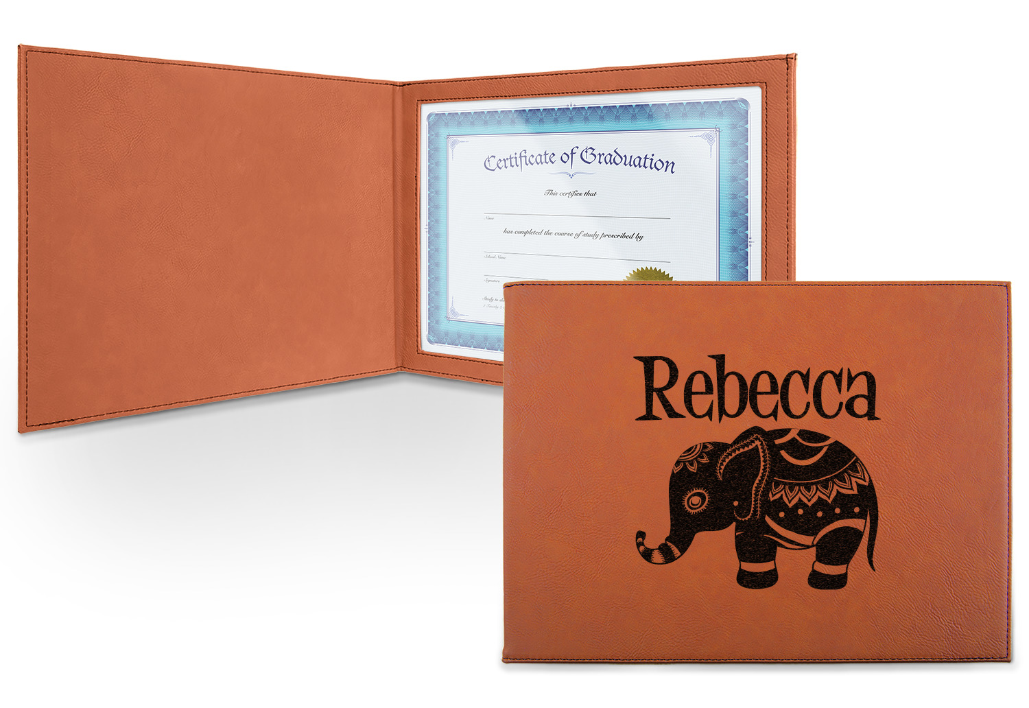 This cognac-colored, leatherette certificate jacket is the ideal way to display or store your hard-earned certificate. When closed, the custom certificate holder measures at 12 by 9 inches. The interior of the certificate cover includes a clear, vinyl window to encase your diploma. The window measures at around 10.5 by 7.5 inches and can accommodate a diploma that measures at up to 8.5 by 11 inches. You can either choose to have your customization laser engraved on the front and interior, or solely the front.