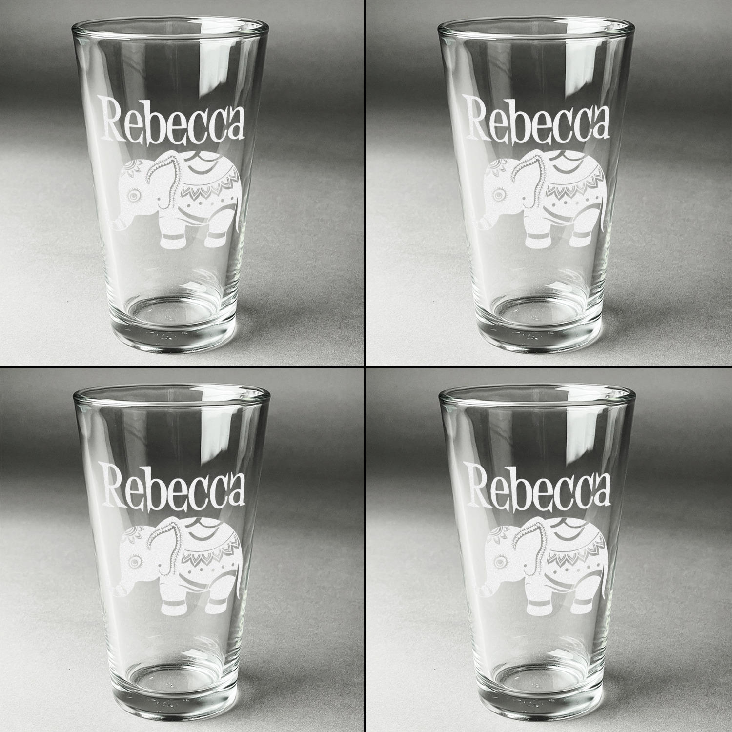 Available in a single glass or a set of 4 - each glass will be custom engraved with your design. Each glass holds 16 oz and measure 5.75"H x 3.5"W.