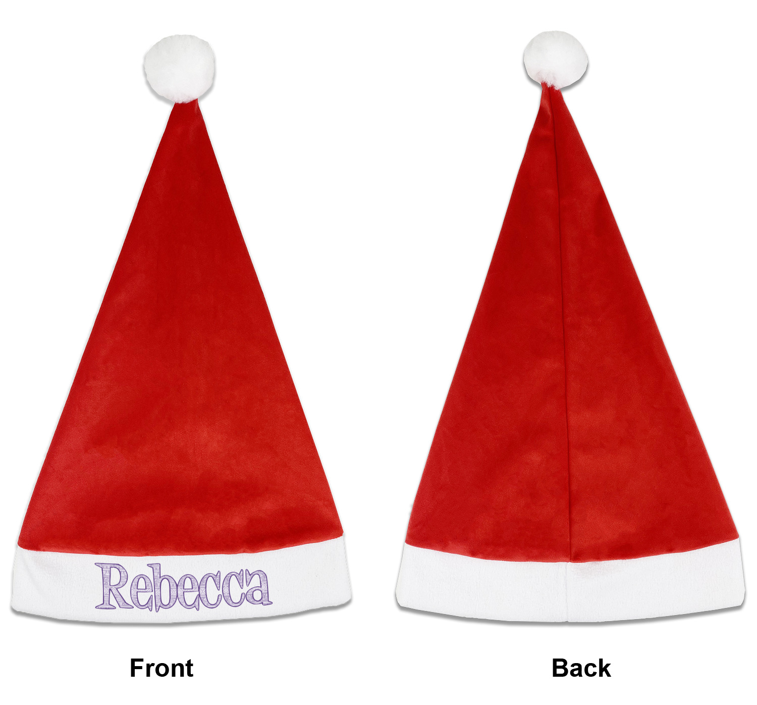 Our Santa hats are a soft, velvety polyester material. These customizable Santa hats are a classic red with white brimming and pom pom ball hanging off the hat tail just like Santa Claus! Each personalized Santa hat is approximately 17.5 L x 11.8 W. We offer two different styles to print your designs on the white brim - front or front & back.