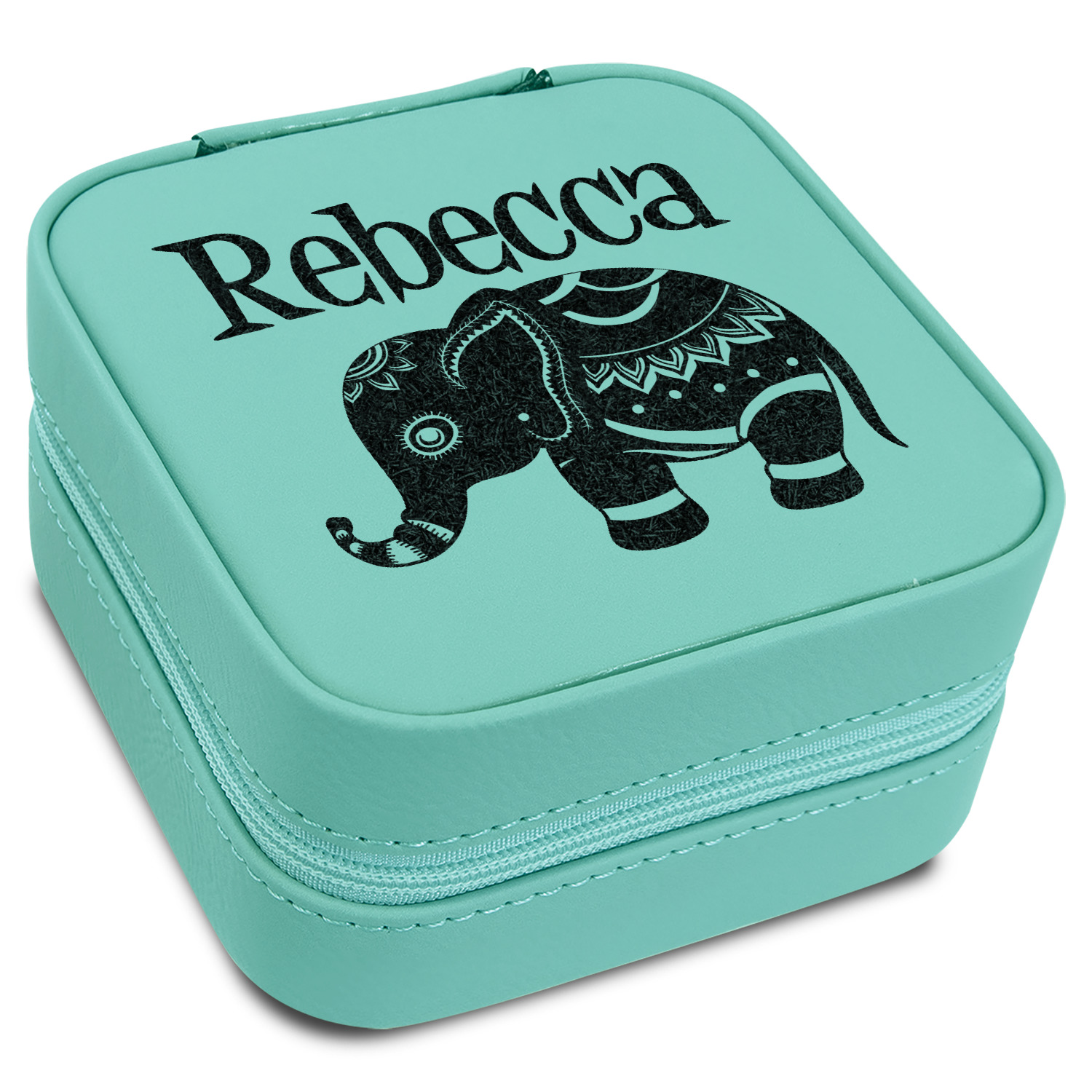 This square zippered travel jewelry box is made from leatherette and is available in four colors - classic cognac / rawhide, a beautiful teal. navy blue or pink. The tan colored soft velvet inside has compartments and hooks for all your jewelry - rings, chains, earrings, bangles etc.