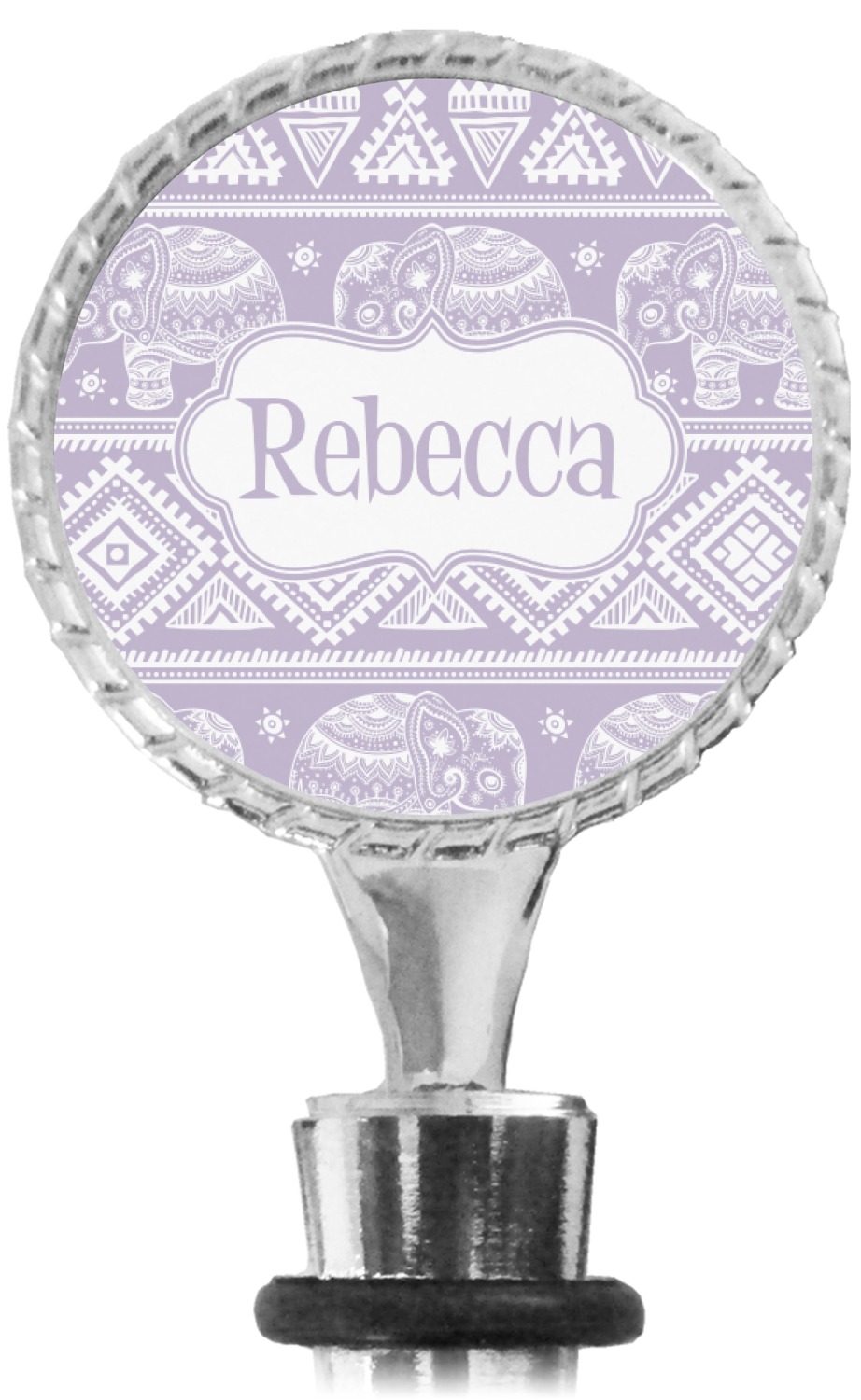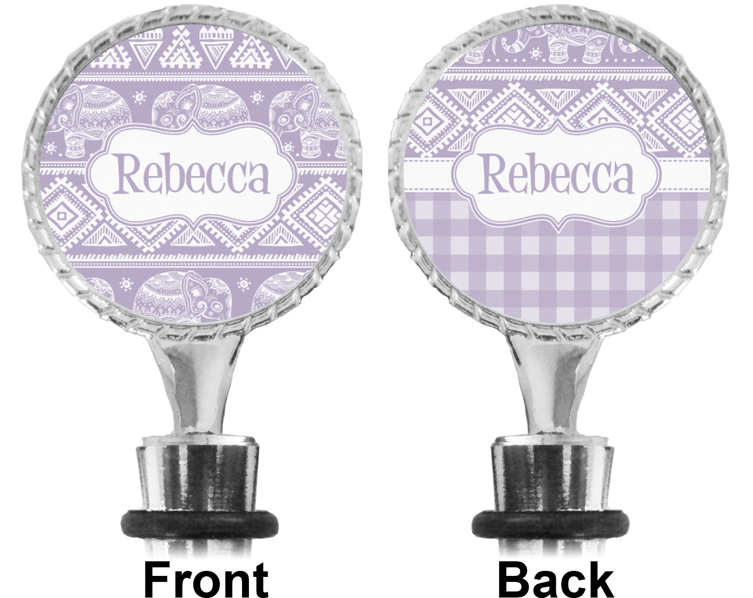 The top part of your bottle stopper is comprised of a zinc ring that displays your customization(s) in its middle, on both sides. The ring is heavy duty, with a bright chrome finish. The body of the wine stoppers have two silicone rings to provide an airtight seal. These wine bottle stoppers measure at 1.625" L x 0.8125" W x 4.625" H; your custom wine stopper is meant to fit into most standard-sized wine bottles.