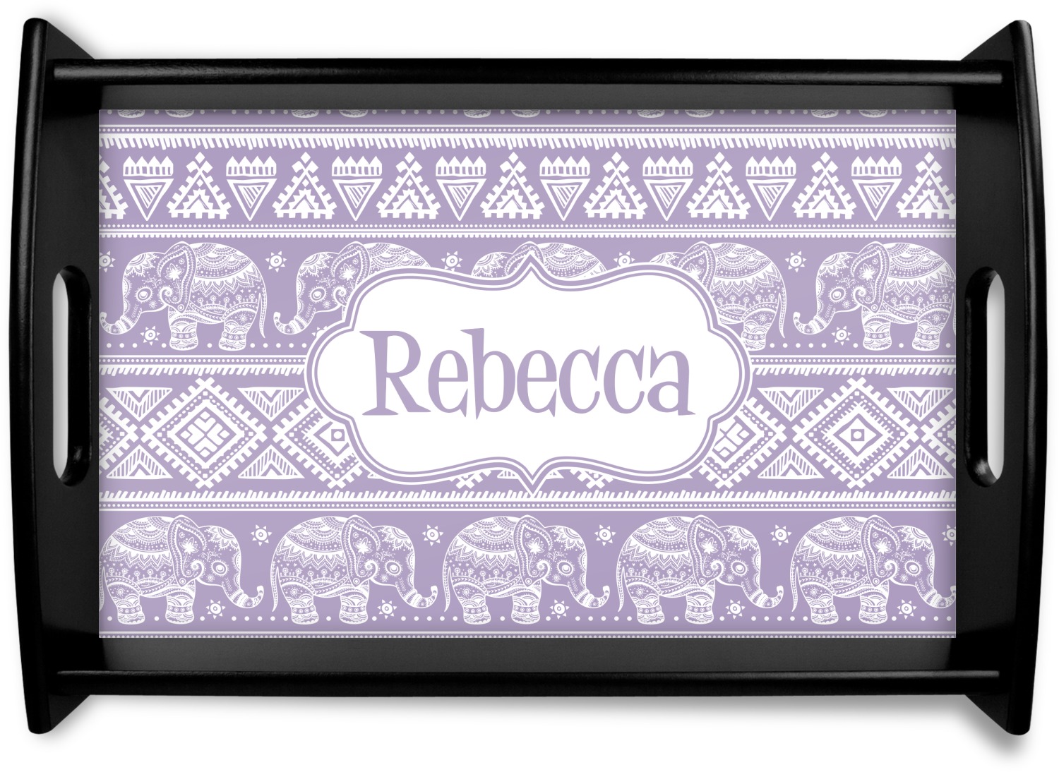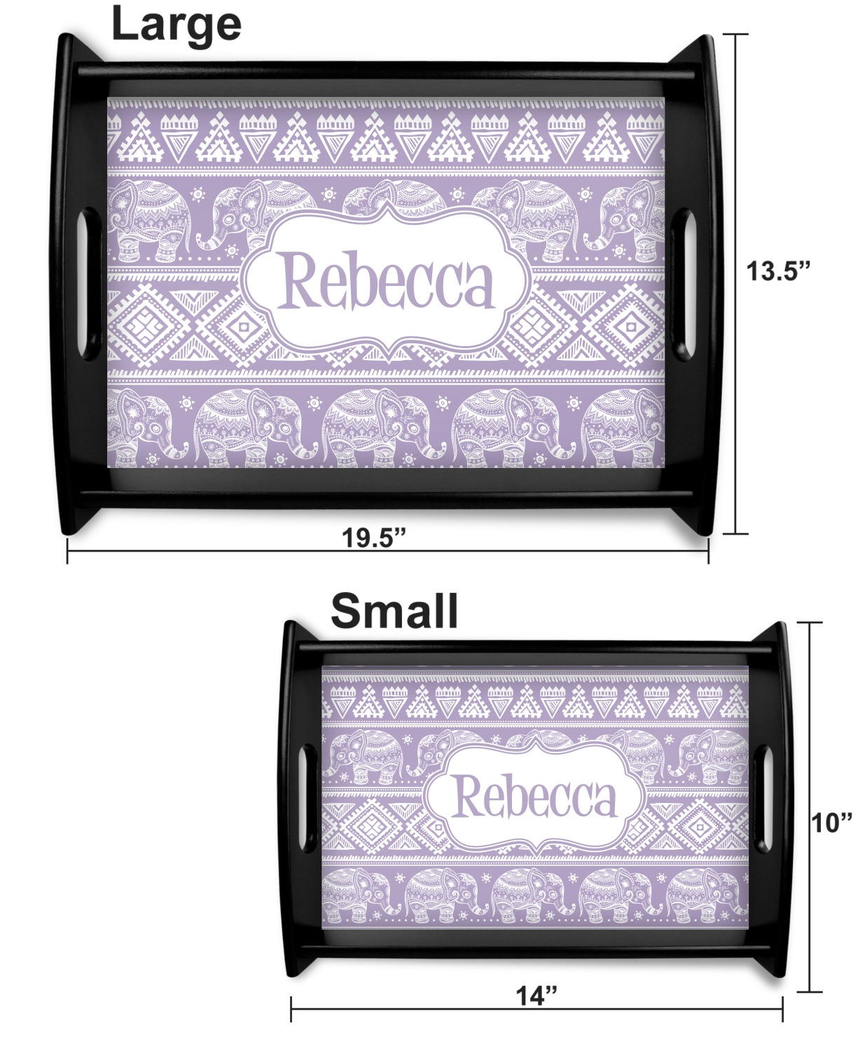 This serving tray with handles features square edges and two rounded sides, creating a very modern look. Each side is fabricated from a beautifully cut, natural wood. The bottom of the interior of the tray displays your customized design in bright, vibrant color. The tray is sold in both a black color and a natural wood look. Each variation of the wood serving tray has two sizes: Small, which is 14" x 10" x 2.25", and Large, which is 19.5" x 13.5" x 2.75".