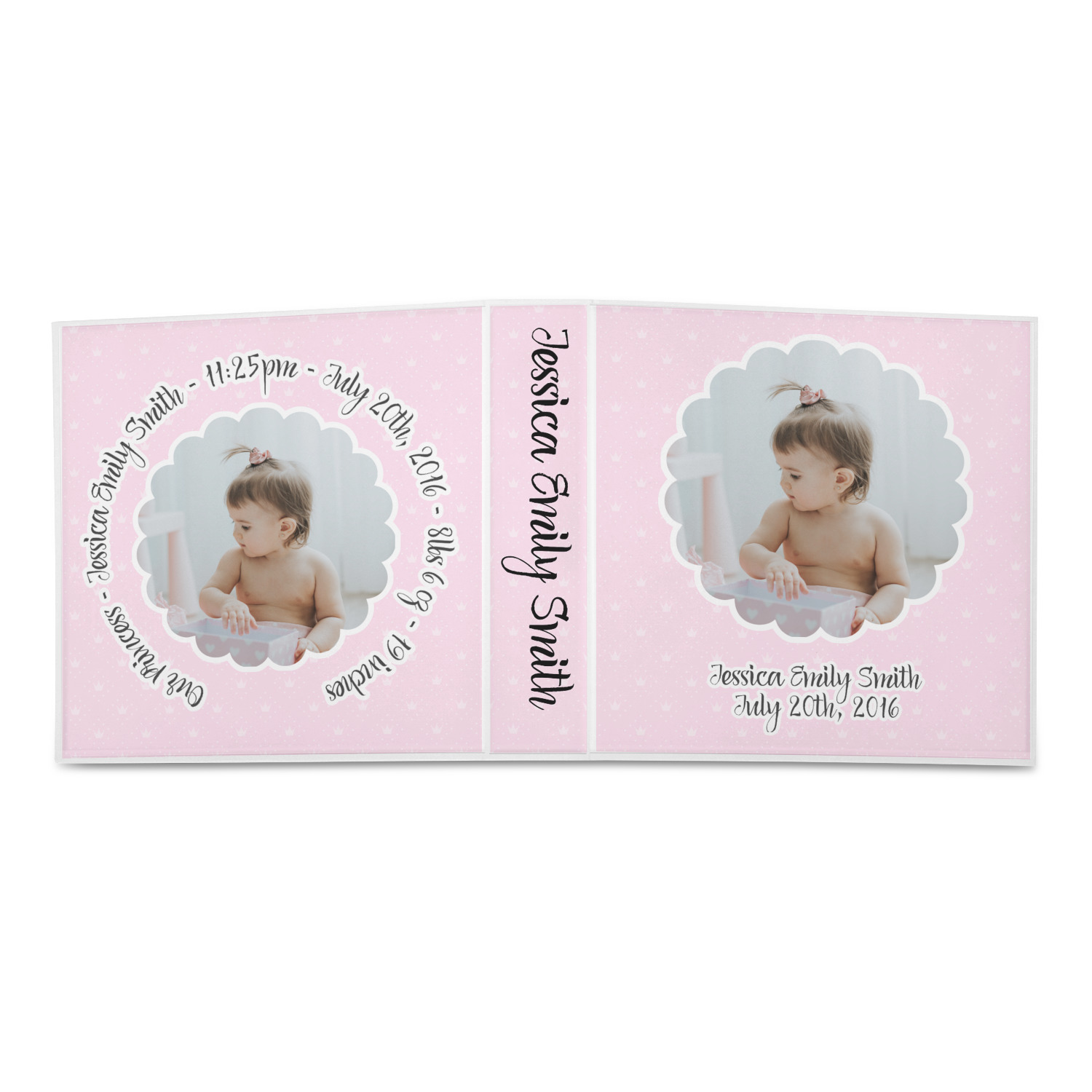 This design is for baby girls. The background is a baby pink background with crowns and polka dots. In the middle of the design is a scalloped frame to upload your baby's picture into (make sure it is high quality!). Underneath you are able to put personalized text with their birthday or whatever you like.