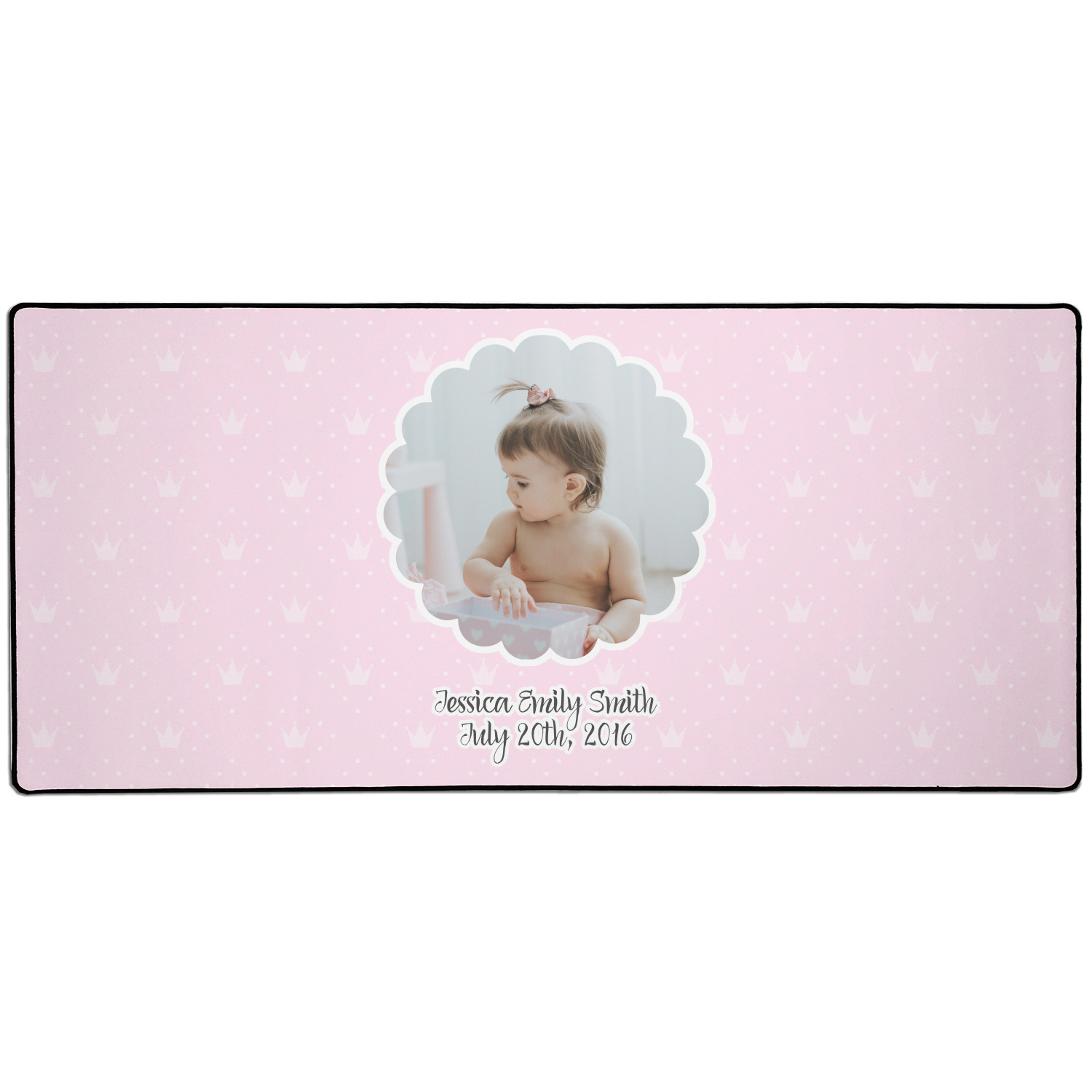 This design is for baby girls. The background is a baby pink background with crowns and polka dots. In the middle of the design is a scalloped frame to upload your baby's picture into (make sure it is high quality!). Underneath you are able to put personalized text with their birthday or whatever you like.