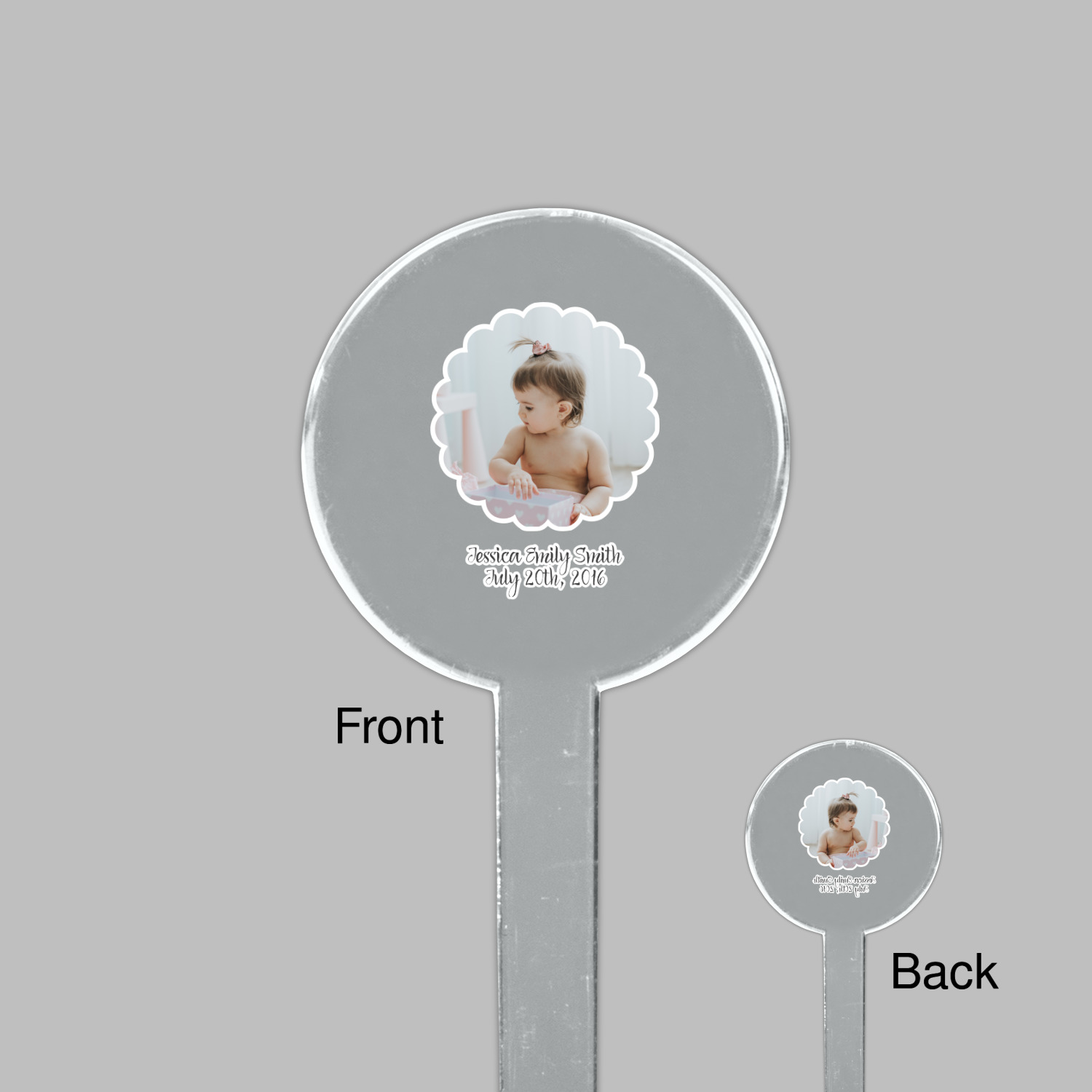 This design is for baby girls. The background is a baby pink background with crowns and polka dots. In the middle of the design is a scalloped frame to upload your baby's picture into (make sure it is high quality!). Underneath you are able to put personalized text with their birthday or whatever you like.