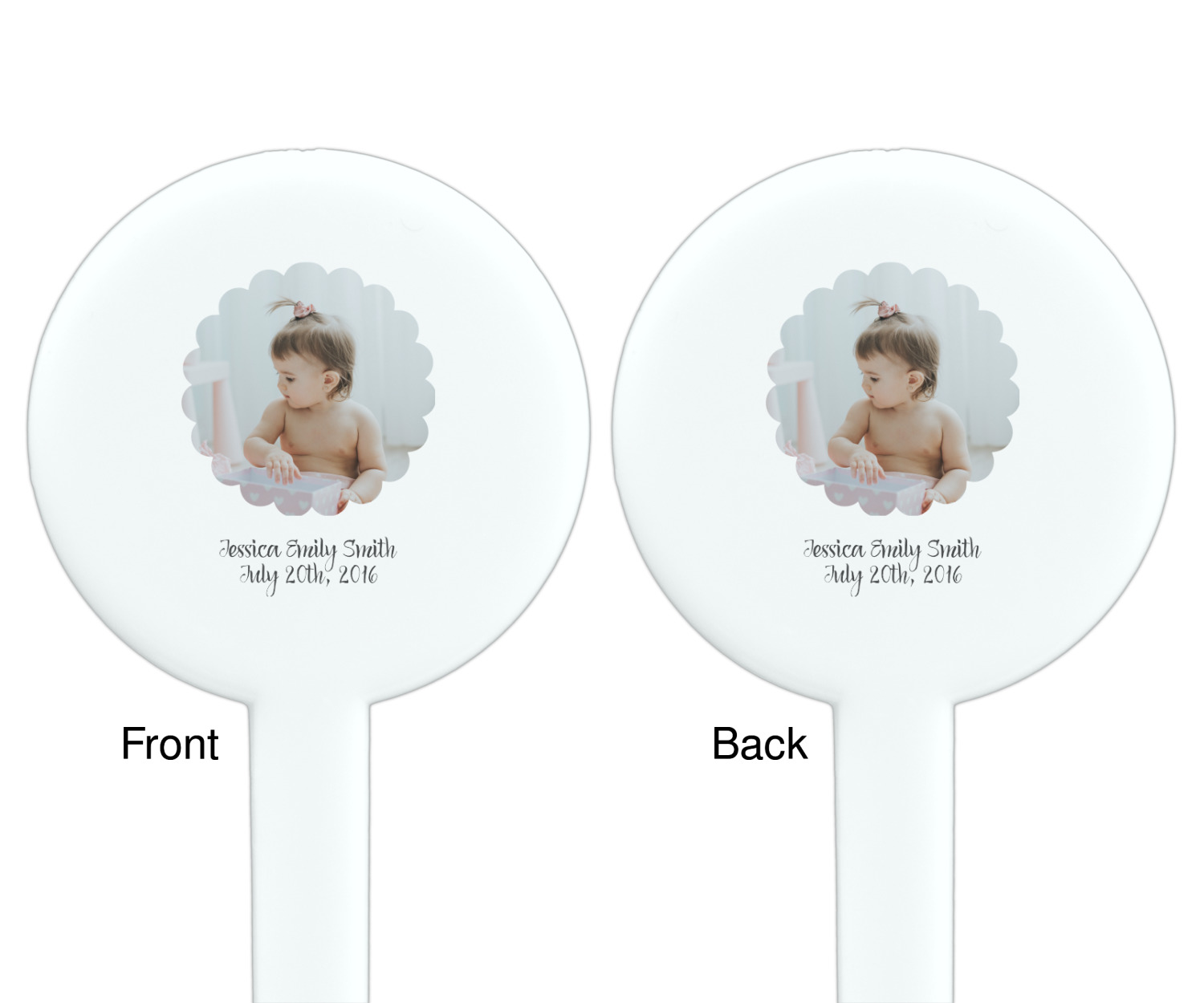 This design is for baby girls. The background is a baby pink background with crowns and polka dots. In the middle of the design is a scalloped frame to upload your baby's picture into (make sure it is high quality!). Underneath you are able to put personalized text with their birthday or whatever you like.