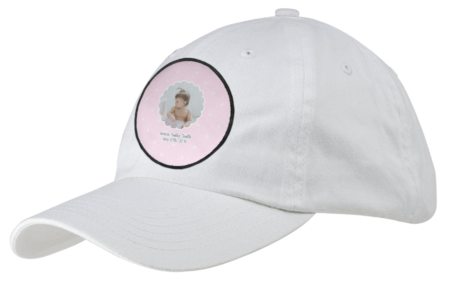 This design is for baby girls. The background is a baby pink background with crowns and polka dots. In the middle of the design is a scalloped frame to upload your baby's picture into (make sure it is high quality!). Underneath you are able to put personalized text with their birthday or whatever you like.