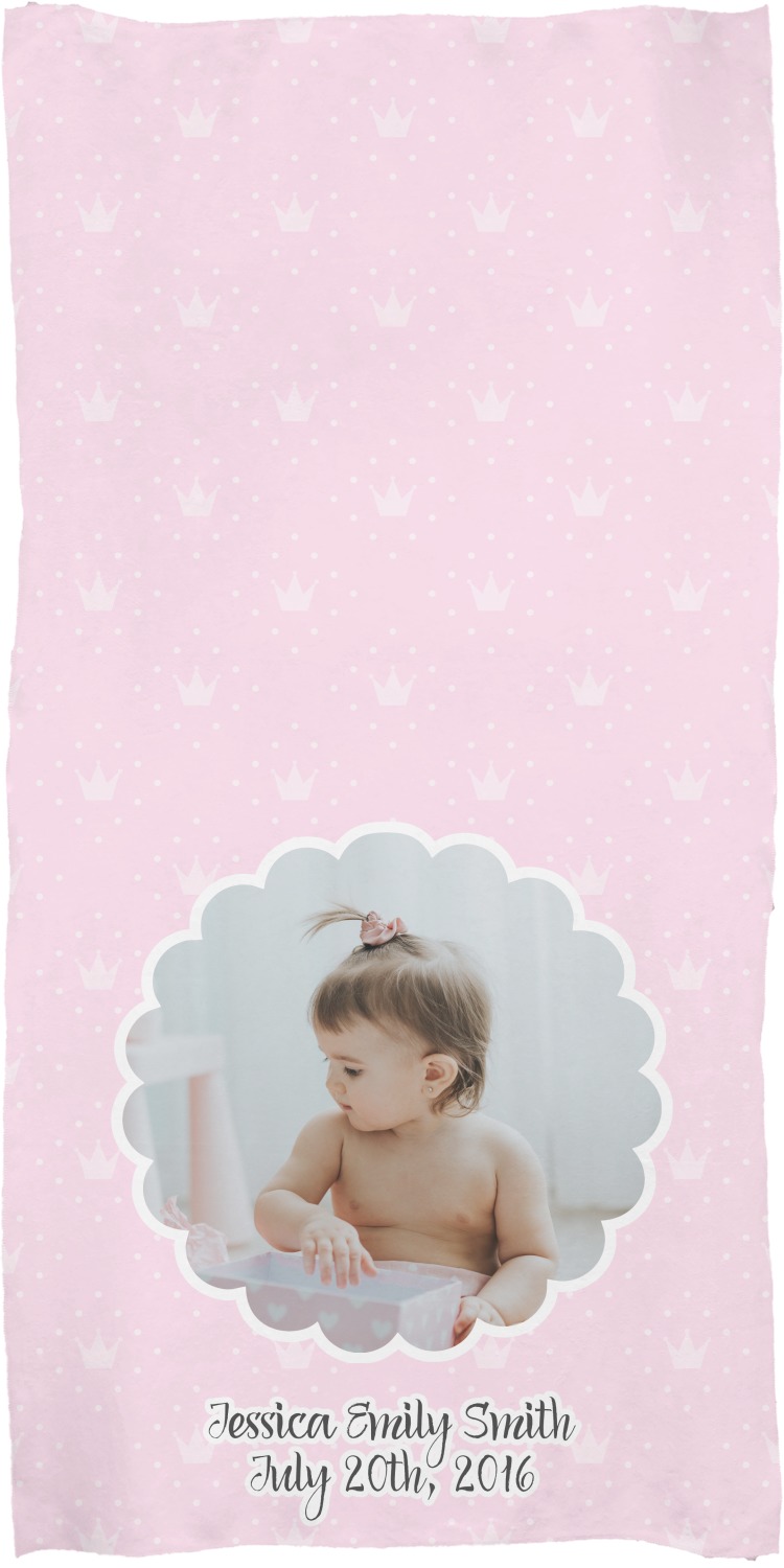 These customized bath towels are slightly larger than your standard towel and are the ideal size for wrapping around your body. They measure approximately 60" x 30". Your customization is displayed across the entire front face of the towel, while the back is white.
