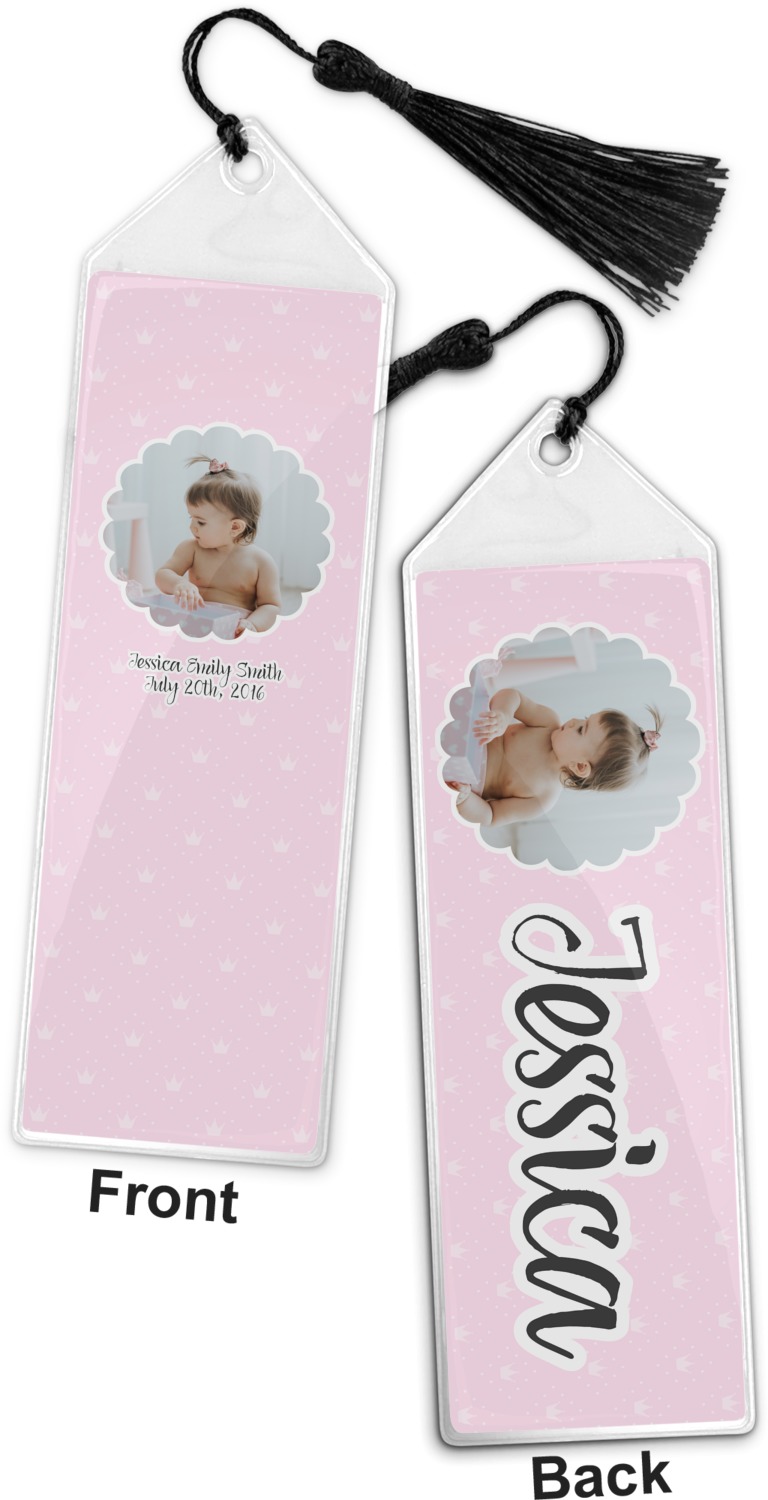 Your personalized bookmark is made of a sturdy, clear vinyl, and is approximately 7.5" x 2.25". We display your personalization on vinyl inserts that are placed on both sides. Accompanying each book marker is a black, fringe tassel that attaches to the reinforced, triangular header.