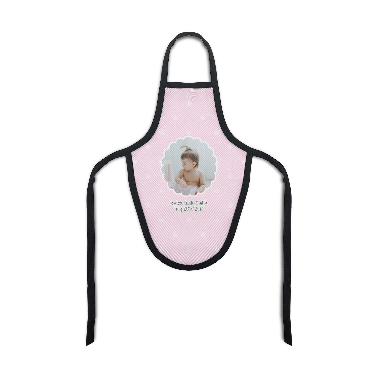 This design is for baby girls. The background is a baby pink background with crowns and polka dots. In the middle of the design is a scalloped frame to upload your baby's picture into (make sure it is high quality!). Underneath you are able to put personalized text with their birthday or whatever you like.