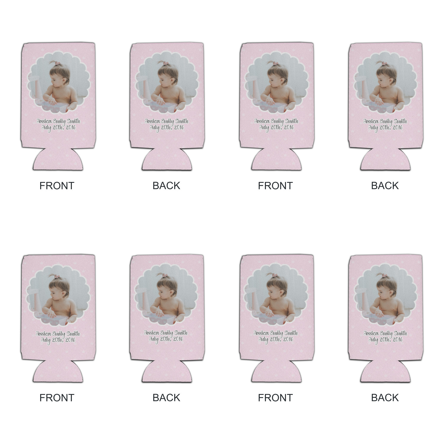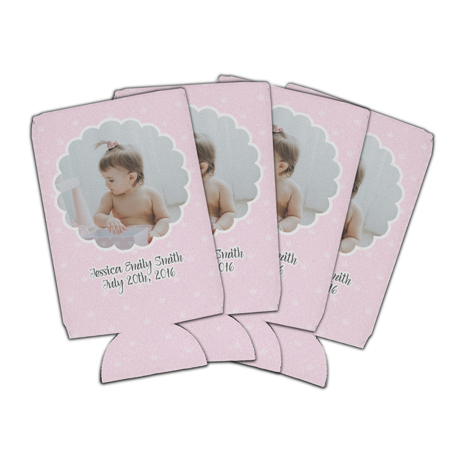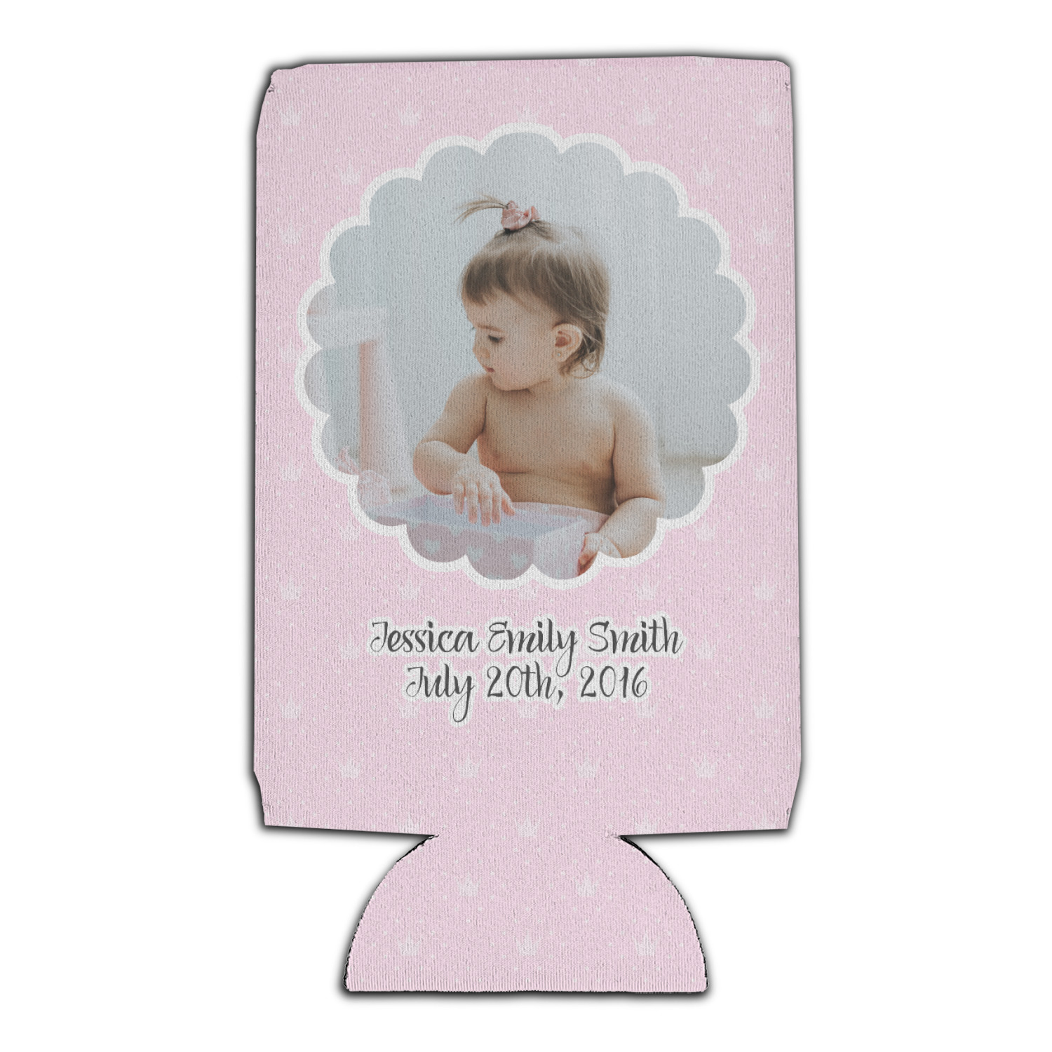 This design is for baby girls. The background is a baby pink background with crowns and polka dots. In the middle of the design is a scalloped frame to upload your baby's picture into (make sure it is high quality!). Underneath you are able to put personalized text with their birthday or whatever you like.