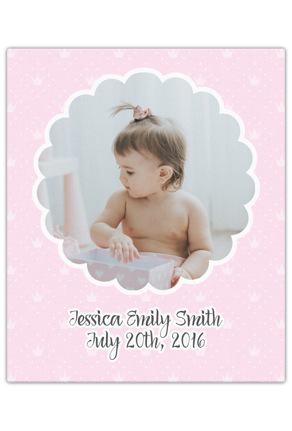 This design is for baby girls. The background is a baby pink background with crowns and polka dots. In the middle of the design is a scalloped frame to upload your baby's picture into (make sure it is high quality!). Underneath you are able to put personalized text with their birthday or whatever you like.