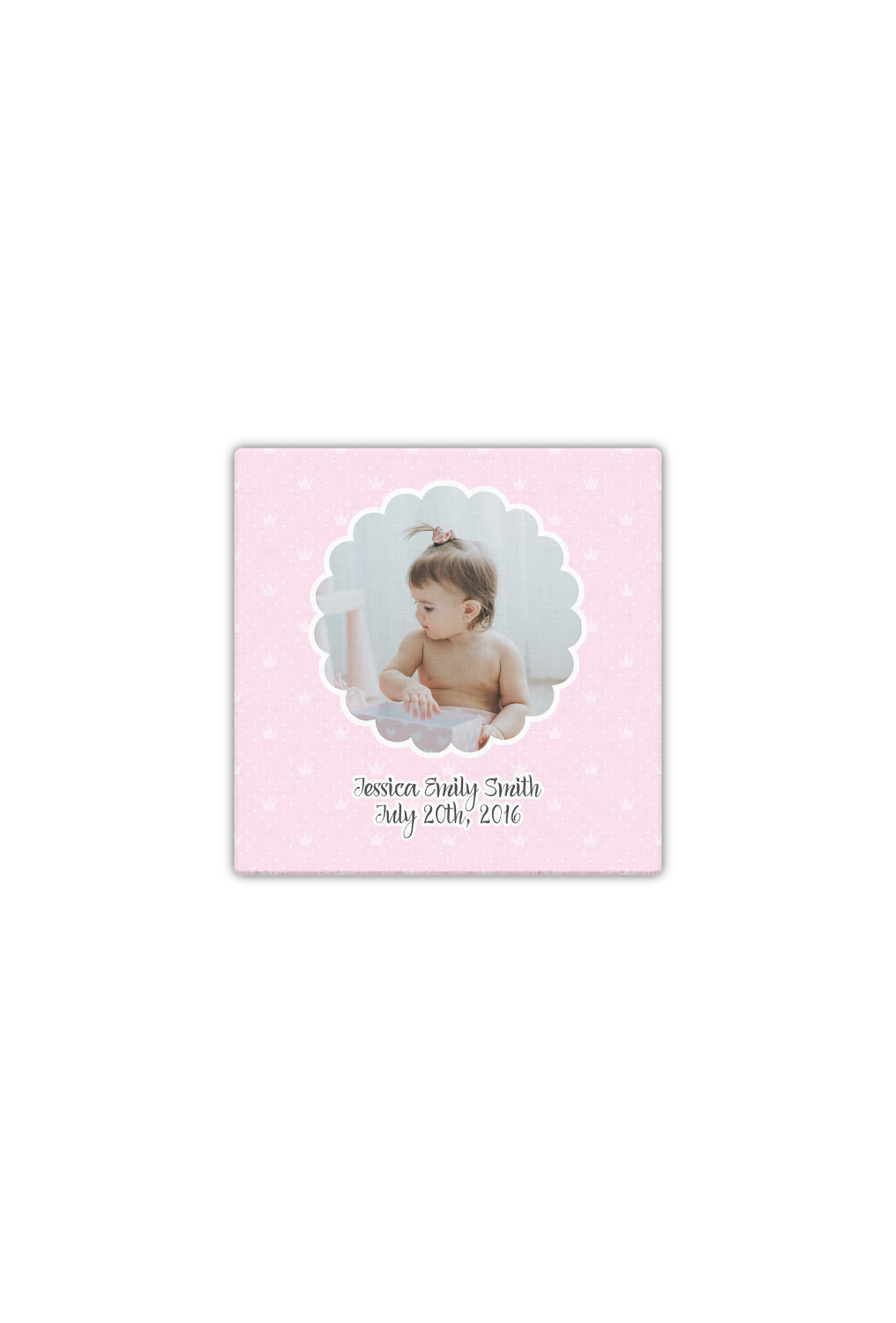 This design is for baby girls. The background is a baby pink background with crowns and polka dots. In the middle of the design is a scalloped frame to upload your baby's picture into (make sure it is high quality!). Underneath you are able to put personalized text with their birthday or whatever you like.