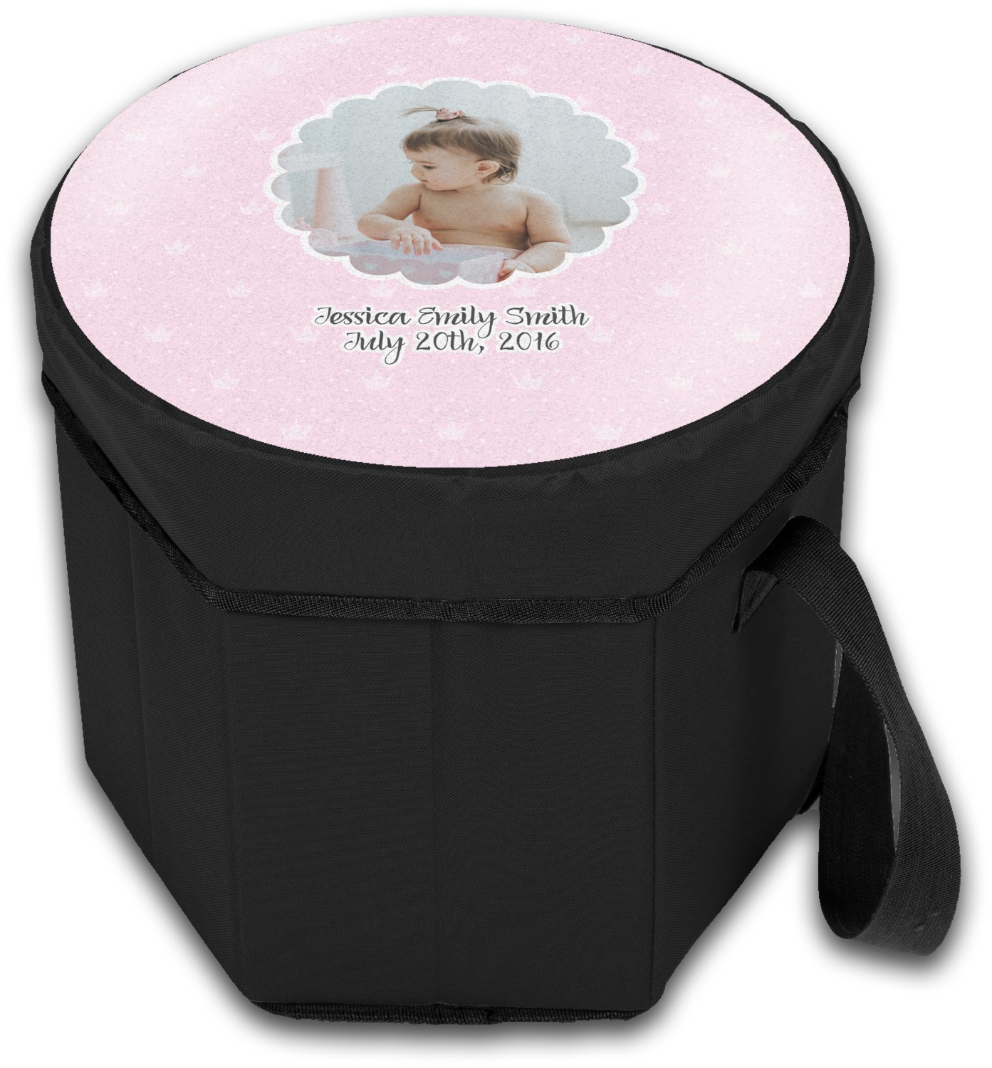 Our collapsible insulated coolers feature a unique six-sided hexagon shape, are lightweight, durable and can be turned into a seat. This cooler is fully insulated with silver foil lining to keep food and drinks hot or cold, and has a 12-quart capacity. Although this cooler collapses for easy transport, hidden inside are composition panels made of sturdy wood that give the frame strength and allow this cooler to be used as a seat. Simply sit down on the personalized cover and give your legs a break! (Maximum weight capacity of 200 pounds.)