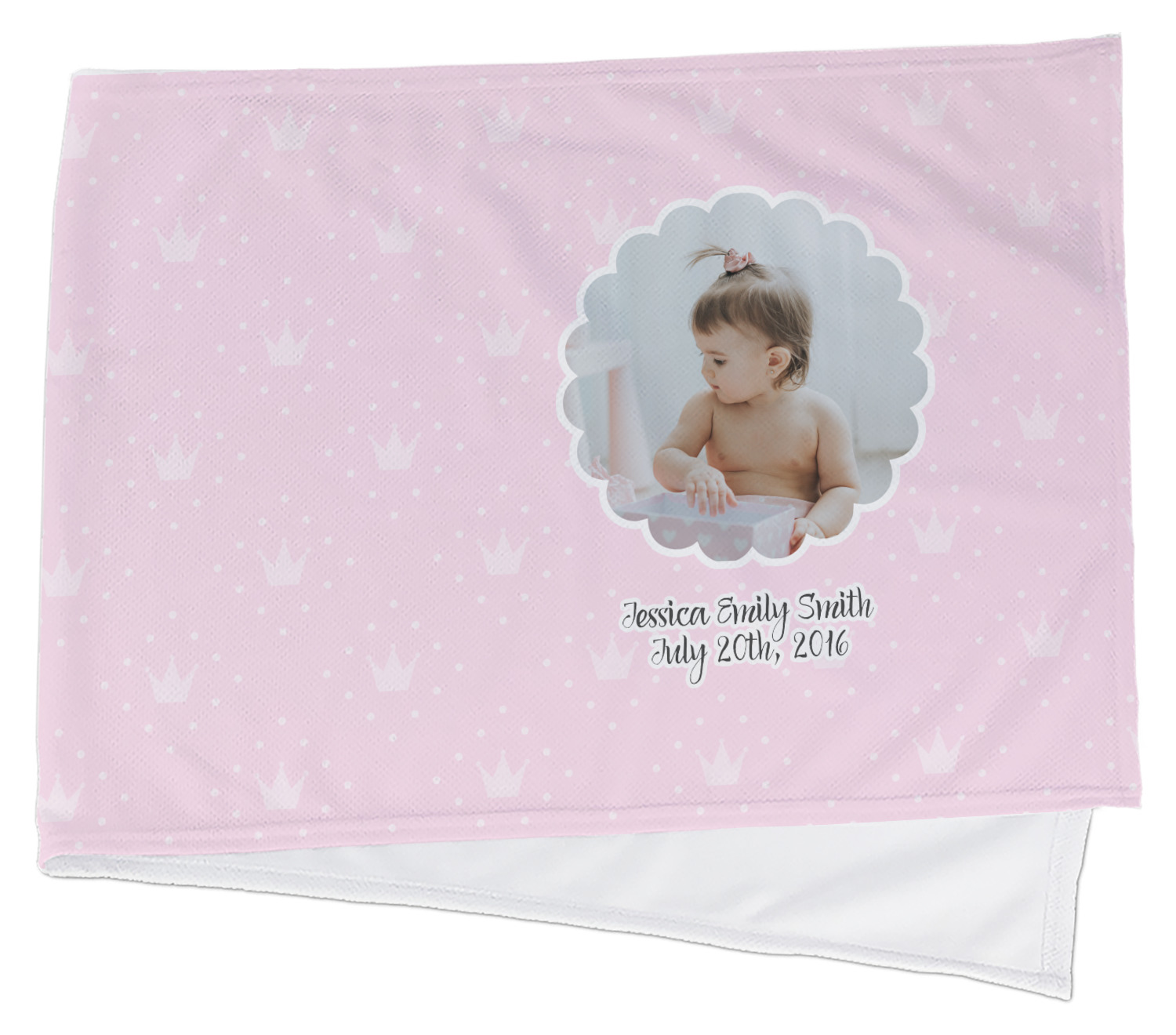This design is for baby girls. The background is a baby pink background with crowns and polka dots. In the middle of the design is a scalloped frame to upload your baby's picture into (make sure it is high quality!). Underneath you are able to put personalized text with their birthday or whatever you like.