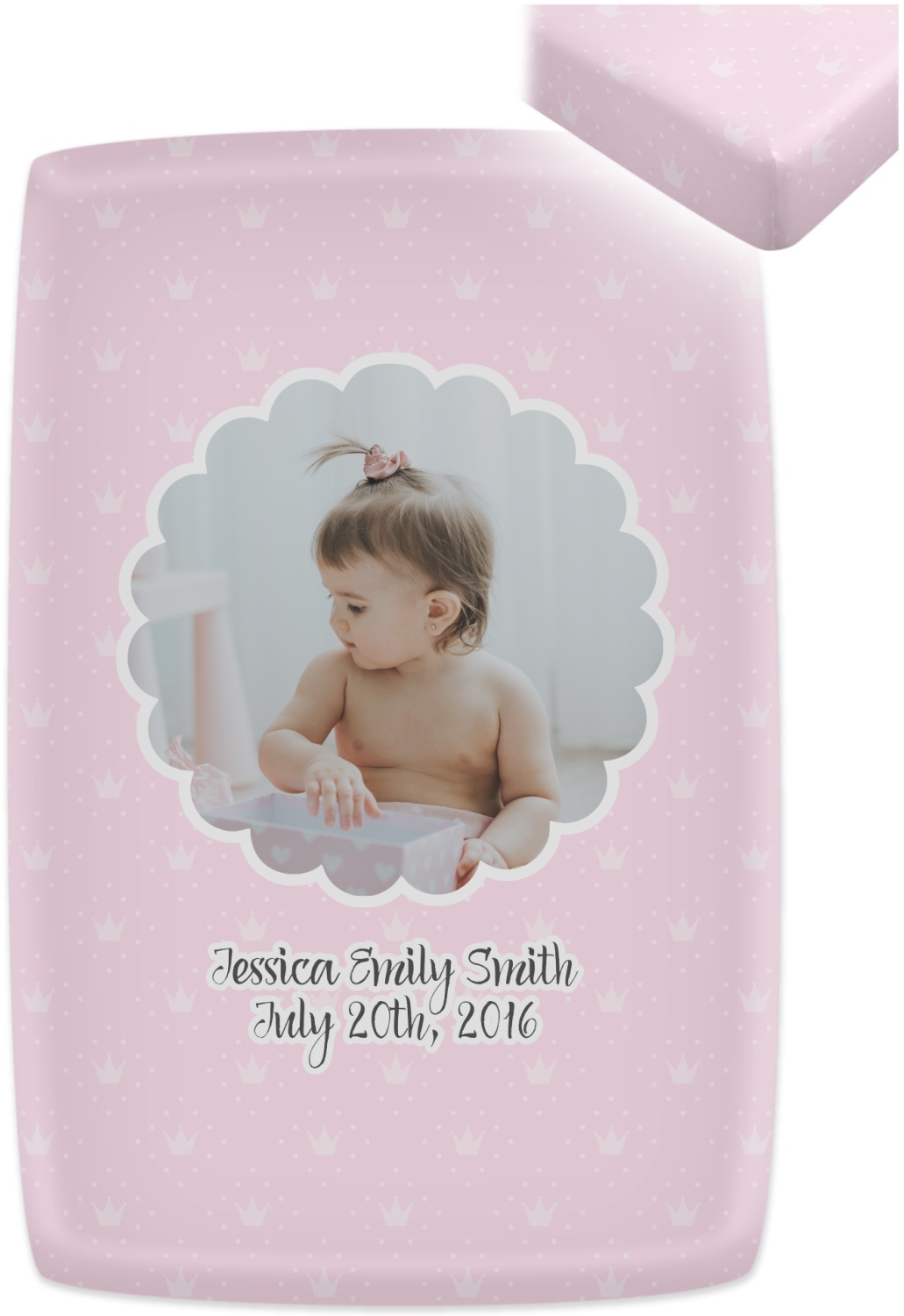 This design is for baby girls. The background is a baby pink background with crowns and polka dots. In the middle of the design is a scalloped frame to upload your baby's picture into (make sure it is high quality!). Underneath you are able to put personalized text with their birthday or whatever you like.