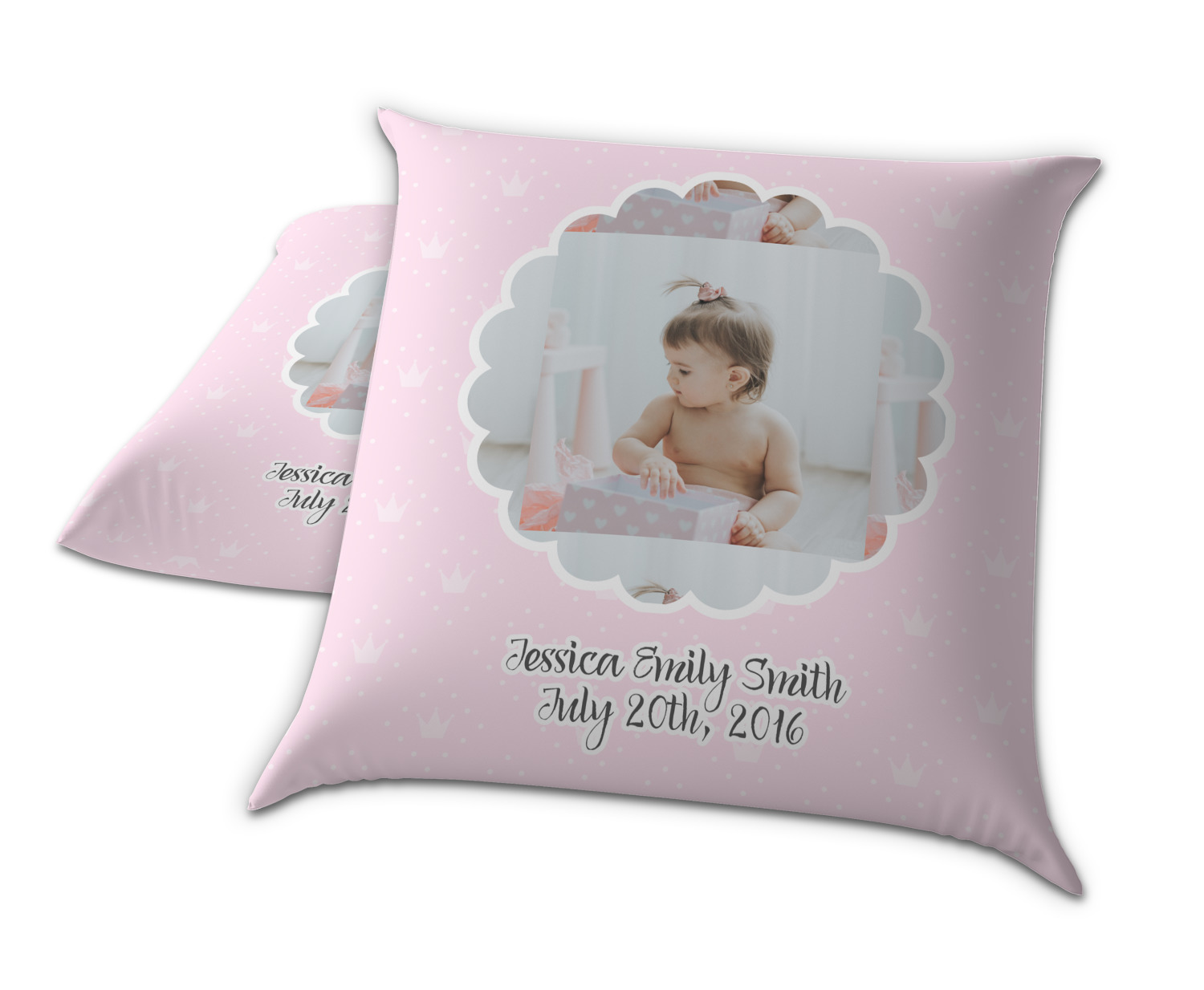 This design is for baby girls. The background is a baby pink background with crowns and polka dots. In the middle of the design is a scalloped frame to upload your baby's picture into (make sure it is high quality!). Underneath you are able to put personalized text with their birthday or whatever you like.