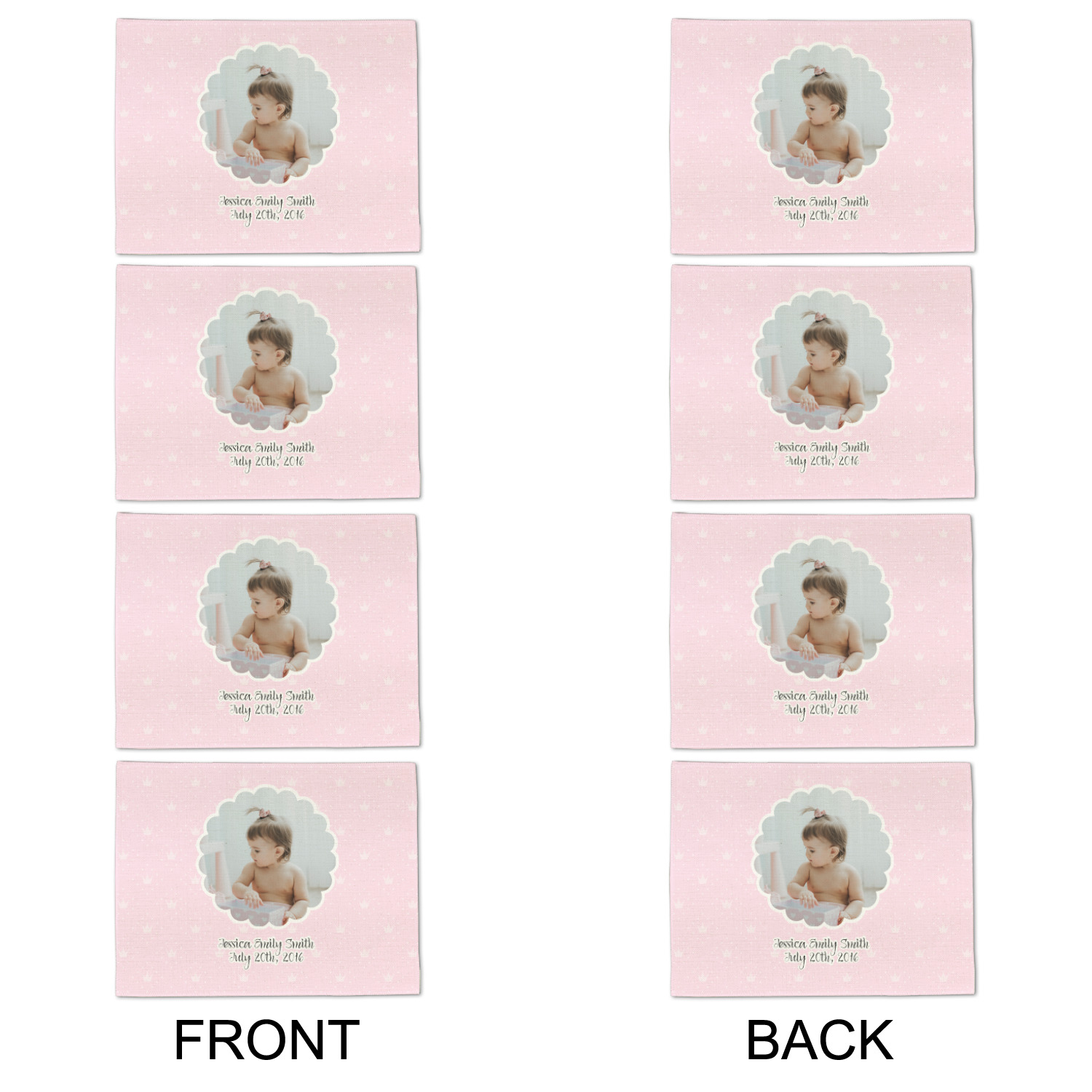 This design is for baby girls. The background is a baby pink background with crowns and polka dots. In the middle of the design is a scalloped frame to upload your baby's picture into (make sure it is high quality!). Underneath you are able to put personalized text with their birthday or whatever you like.