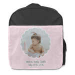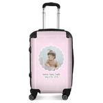 This design is for baby girls. The background is a baby pink background with crowns and polka dots. In the middle of the design is a scalloped frame to upload your baby's picture into (make sure it is high quality!). Underneath you are able to put personalized text with their birthday or whatever you like.