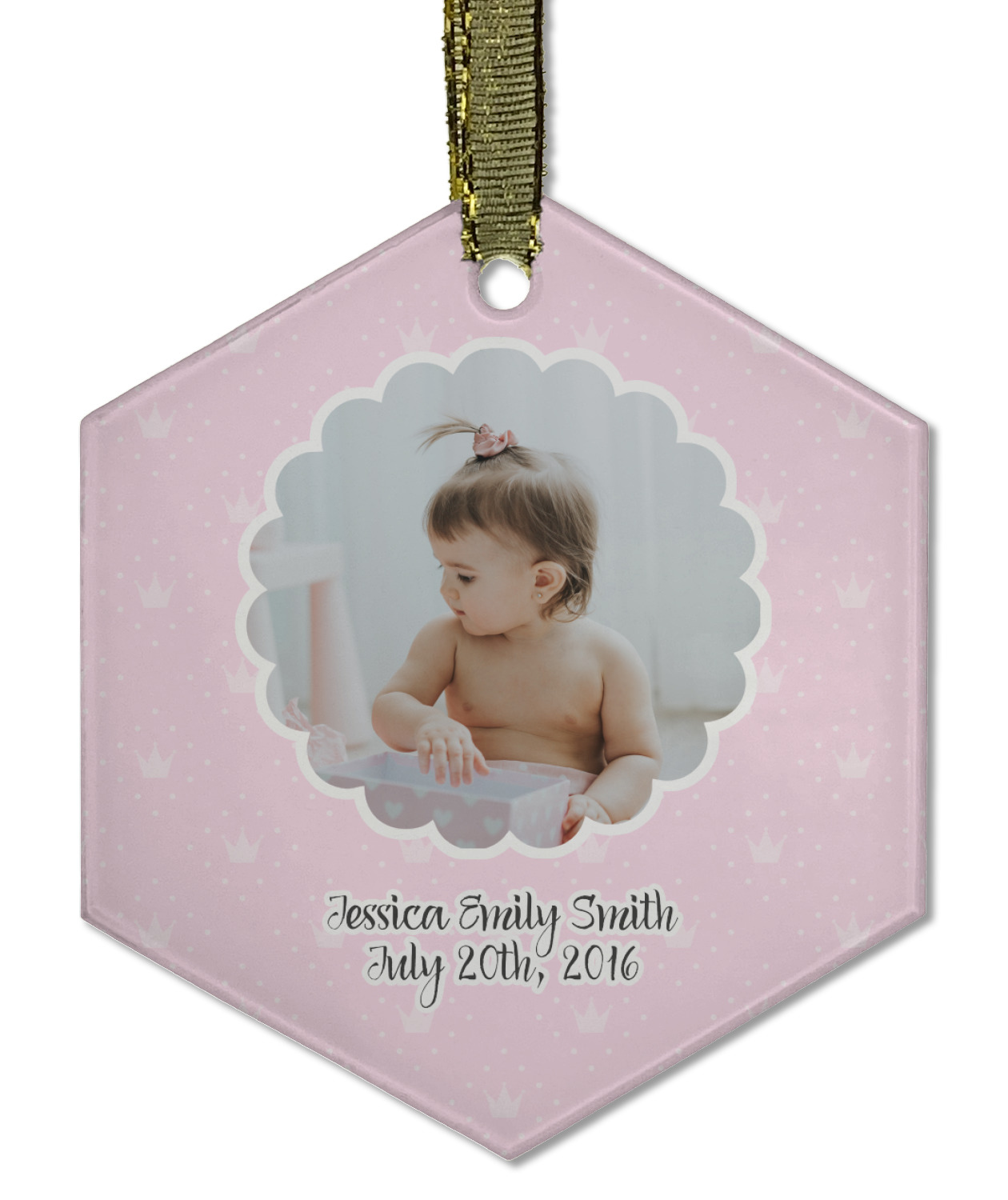 Each of our flat glass ornaments come with a gold string to hang on your Christmas tree with style! We offer two different shapes - flat, round ball or a hexagon. Both glass ornaments have a frosted coating on one side where we print your design while the other side is a clear gloss to give your personalized ornament a sheen finish. Our flat round glass ornament is approximately 3.5" x 3.5" while the flat hexagon ornaments are approximately 3.5" x 3".