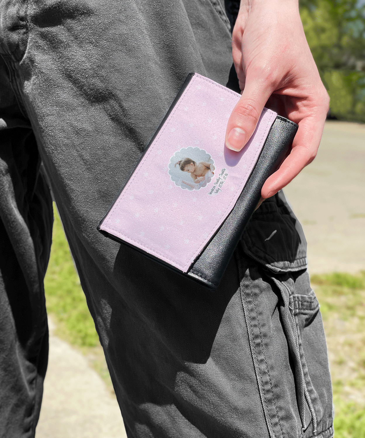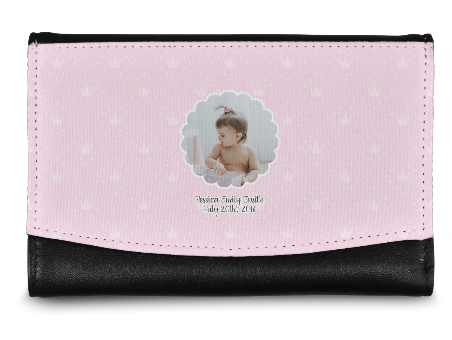 The compact size of this wallet - 5.5in wide, 3.5in tall and 0.75in thick when folded - makes it perfect to hold in hand and small enough to fit in a clutch or a normal size purse. The outside flap is customized with your choice of artwork and closes with a snap closure - with two different snaps to allow it to be adjusted when storing more items - to securely fasten the flap.